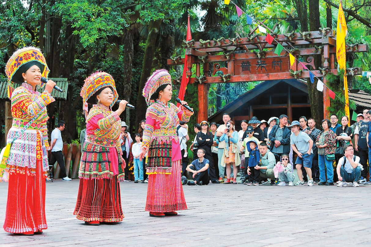 云南民族村工作人员为游客进行讲解。