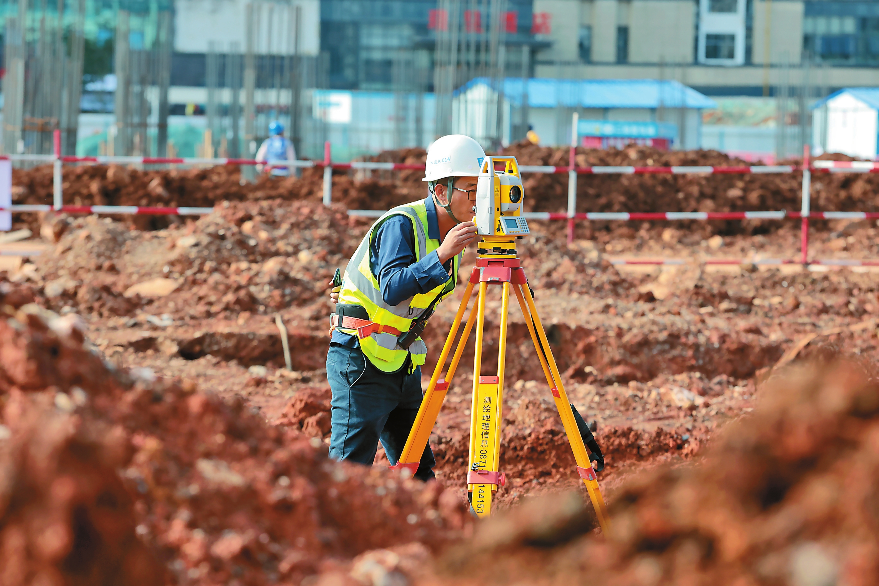 中建二局云南分公司昆明项目建设人员在工地上测绘。