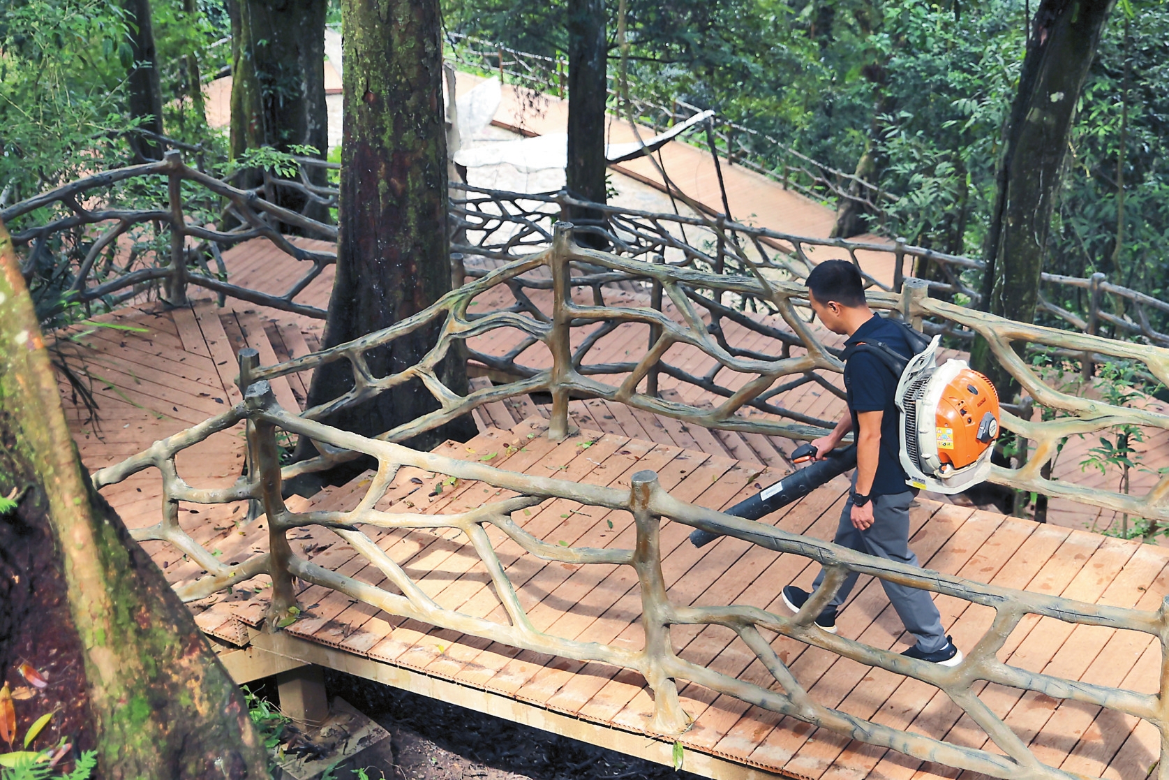 马关县马洒森林步道工作人员在清理落叶。