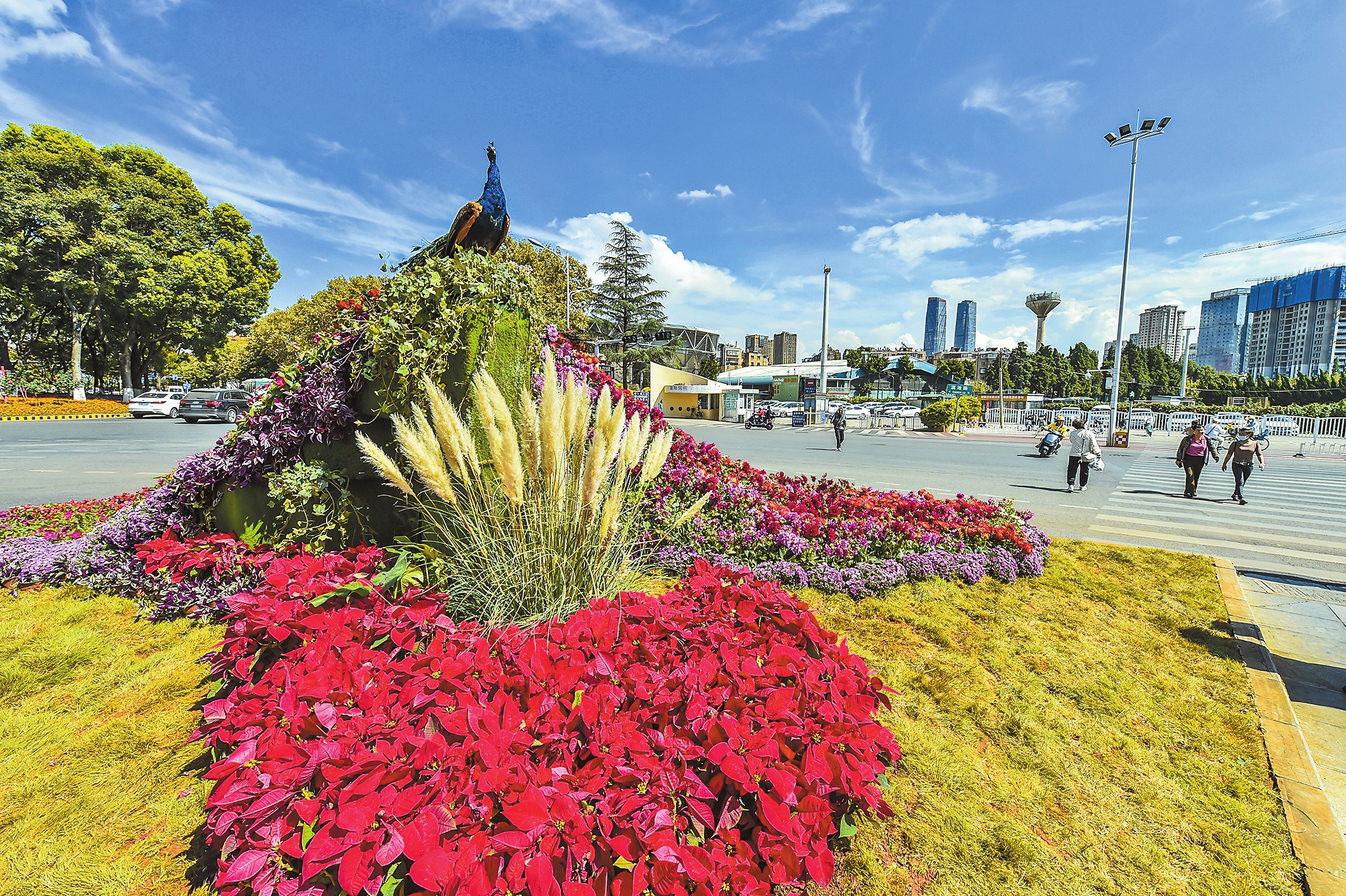 在广福路红星美凯龙门口绿化带,园林绿化部门使用三角梅制作了立体大象造型,搭配变叶木、芭蕉、一品红等;在环城西路与滇池路交叉口,工作人员用海棠、凤仙、菊花、大丽花等“种”出了一只仿真孔雀,吸引市民和游客纷纷打卡留念。