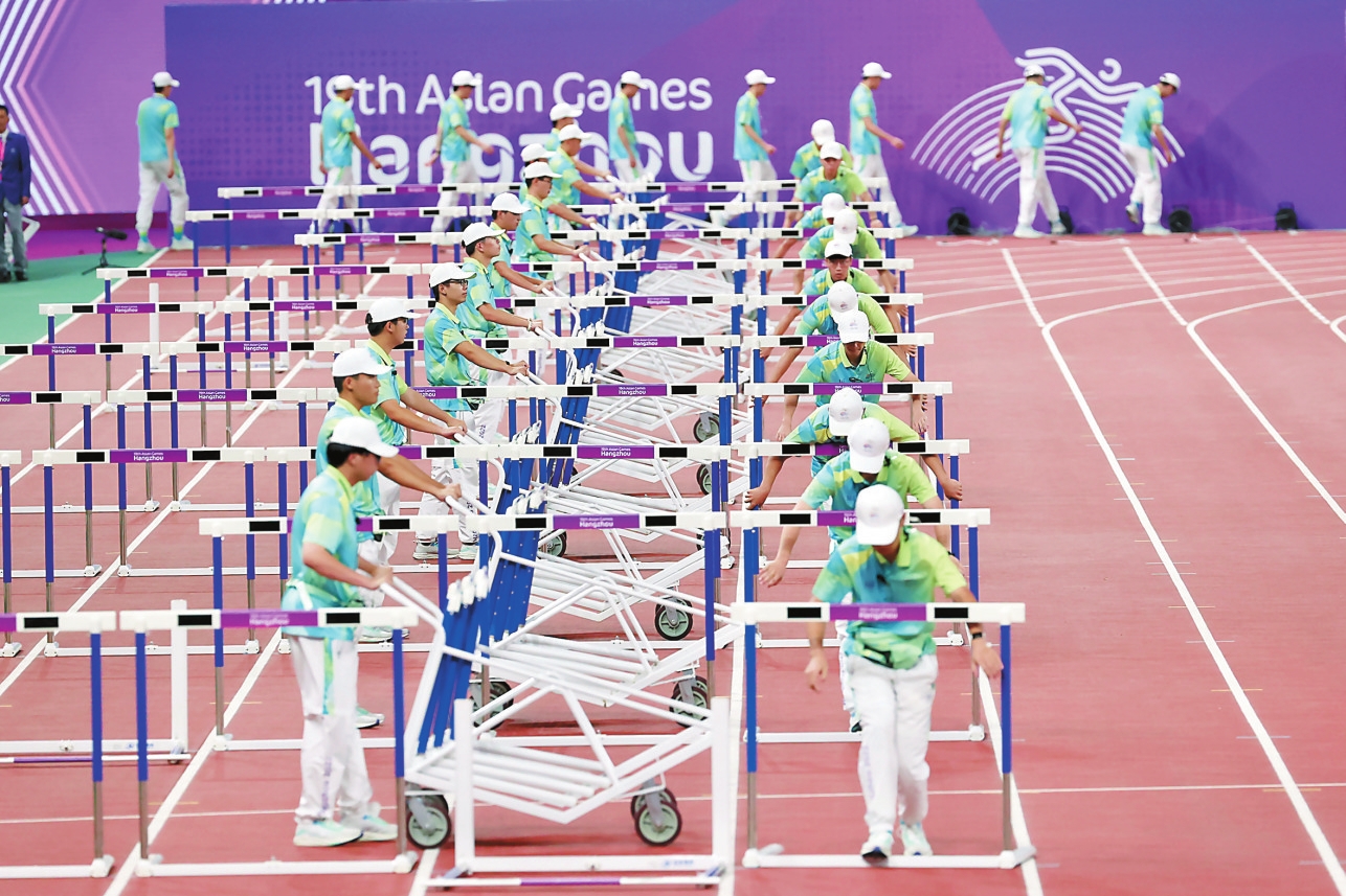 栏架摆放工作虽然在整个田径比赛期间是极小的一个环节,但是亚运会志愿者团队从不放过任何细节的打磨,他们从浙江理工大学专门挑选了24位身高在180厘米左右的男生负责此项工作。“我们从如何摆放栏架开始,不同项目栏架的高度、摆放的间距,每个数据都要熟记。”大二学生刘天颖讲述了他们的培训经历,从8月25日开始,刘天颖和同学们便开始了军事化集训,不论晴空还是暴雨,同学们每天都要坚持到户外训练。“穿着雨衣训练是常态,栏架很重,我们每天训练下来都浑身酸疼。”