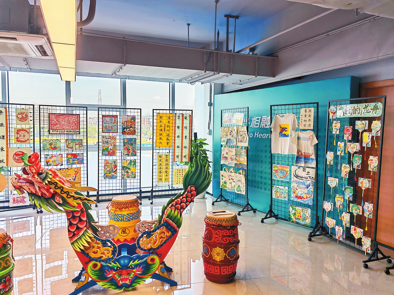 龙舟运动中心负一层是全国单体面积最大的龙舟文化博物馆。在占地面积2250平方米的展馆内,参观者可以了解到龙舟的前世今生和各地龙舟的不同。博物馆对市民免费开放,暑期每天都有超过1000名孩子在这里研学。作为亚运会龙舟赛举办地,温州市瓯海区还将龙舟课程引入了学校,孩子们以亚运和龙舟为主题制作各色作品,在亚运会期间向媒体和运动员进行展示,这些作品承载着孩子们对龙舟传统文化的理解,也将作为礼物送给中外友人。