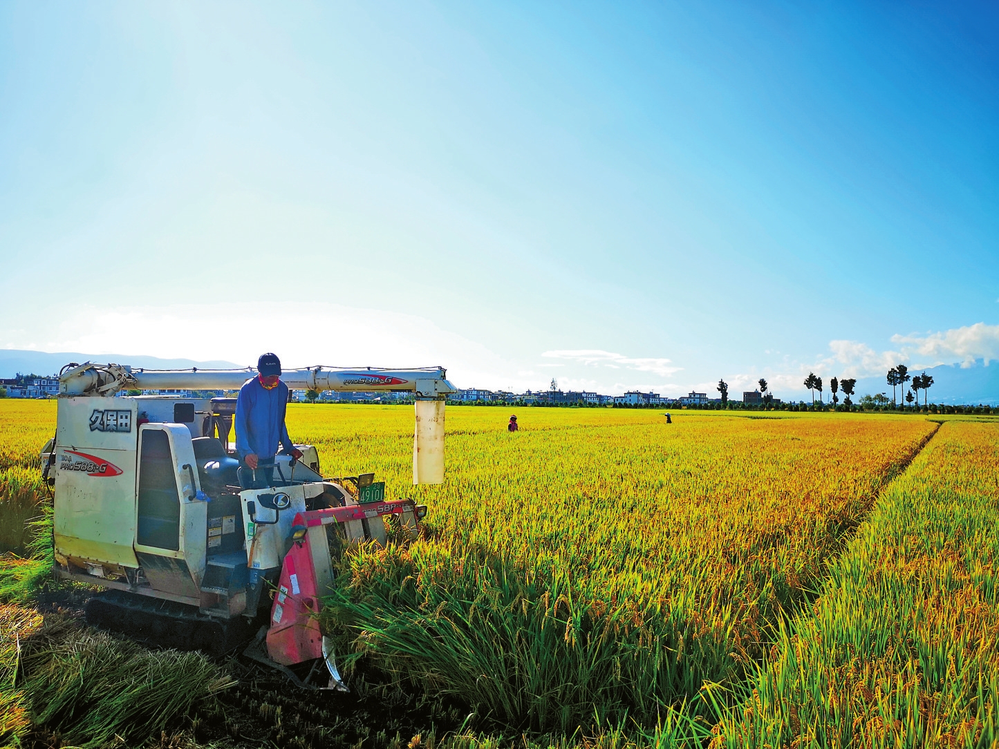 本报讯(记者 秦蒙琳) 10月4日,大理白族自治州洱海流域绿色生态水稻田间观摩与测产活动现场,一台大型收割机驶入大理市湾桥镇古生村苍洱留香7号种植基地,洱海畔2万亩有机水稻开镰收割。