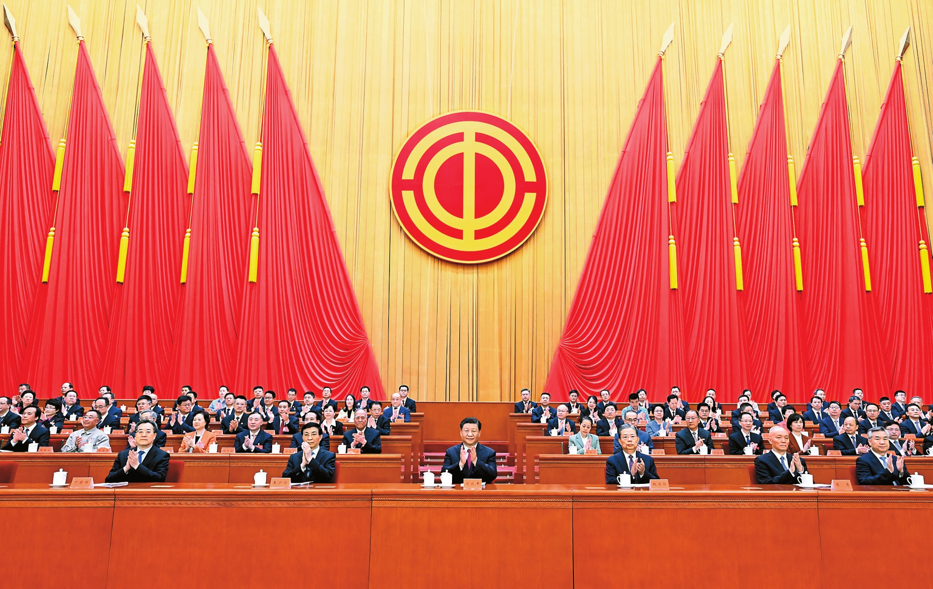 10月9日,中国工会第十八次全国代表大会在北京人民大会堂开幕。习近平、赵乐际、王沪宁、蔡奇、丁薛祥、李希等在主席台就座,祝贺大会召开。 新华社记者 申宏 摄