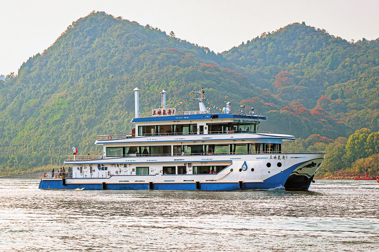 据测算,“三峡氢舟1”号相比传统燃油动力船舶,预计每年可替代燃油103.16吨,减少二氧化碳排放343.67吨。图为10月11日,“三峡氢舟1”号行驶在长江湖北宜昌水域。