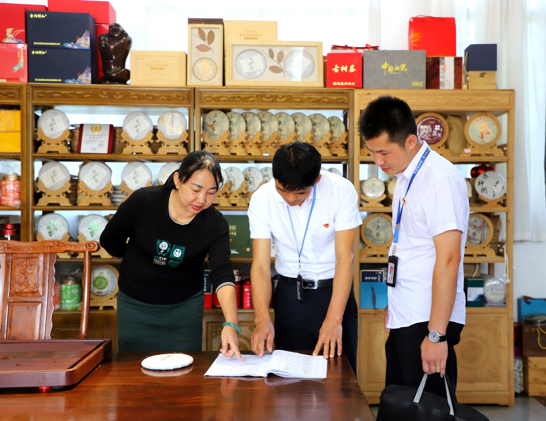 镇沅彝族哈尼族拉祜族自治县纪委监委紧盯隐形变异“四风”问题,成立专项督查组,深入辖区茶店、商超、农家乐等场所开展明察暗访,严防“四风”反弹回潮。图为督查组工作人员近日在千家寨主题街区茶店了解情况。