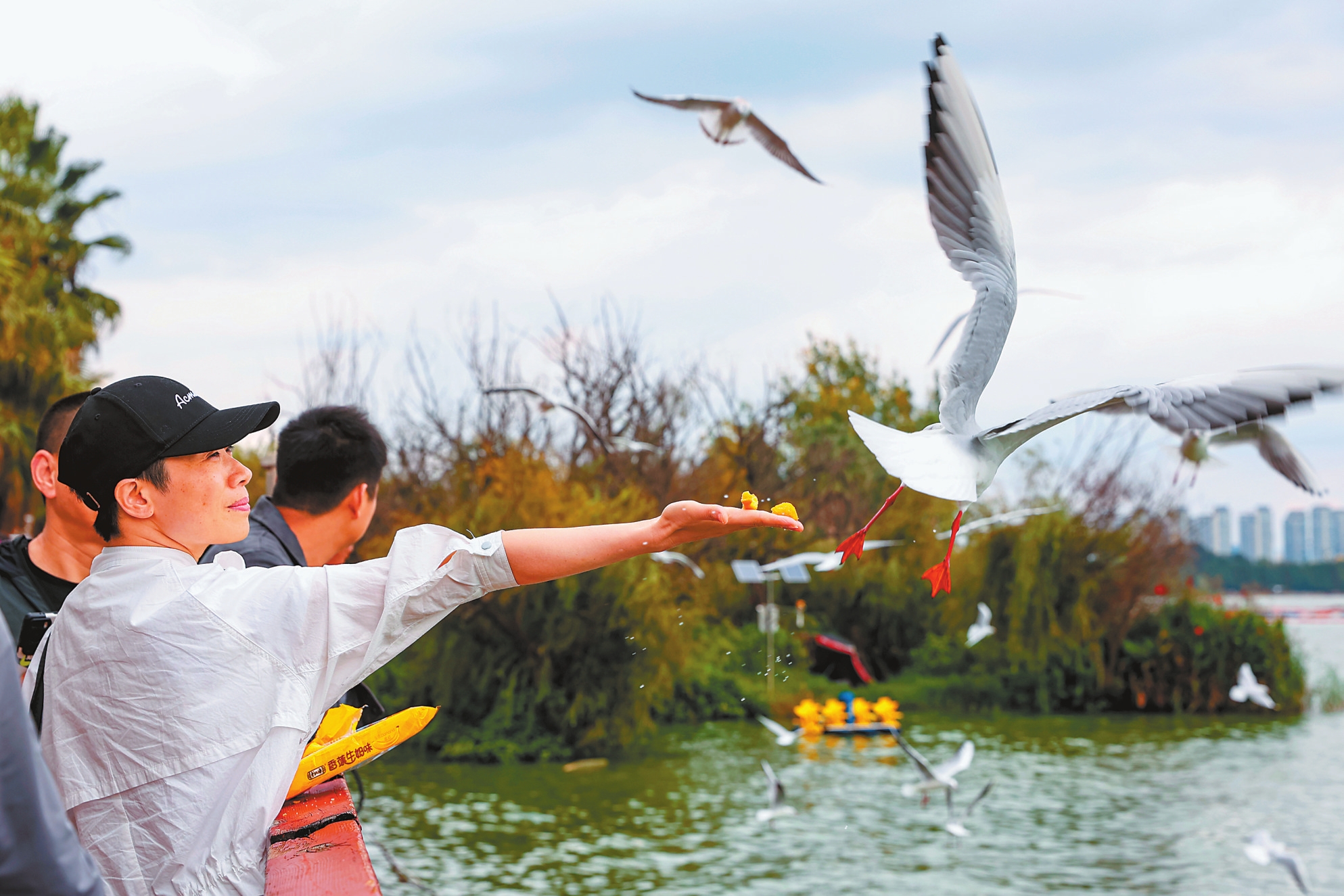10月12日,在昆明海埂东码头,近百只红嘴鸥在堤岸边盘旋,吸引了不少市民游客前来喂食打卡。后续的红嘴鸥将陆续抵昆,预计在11月进入观鸥季。