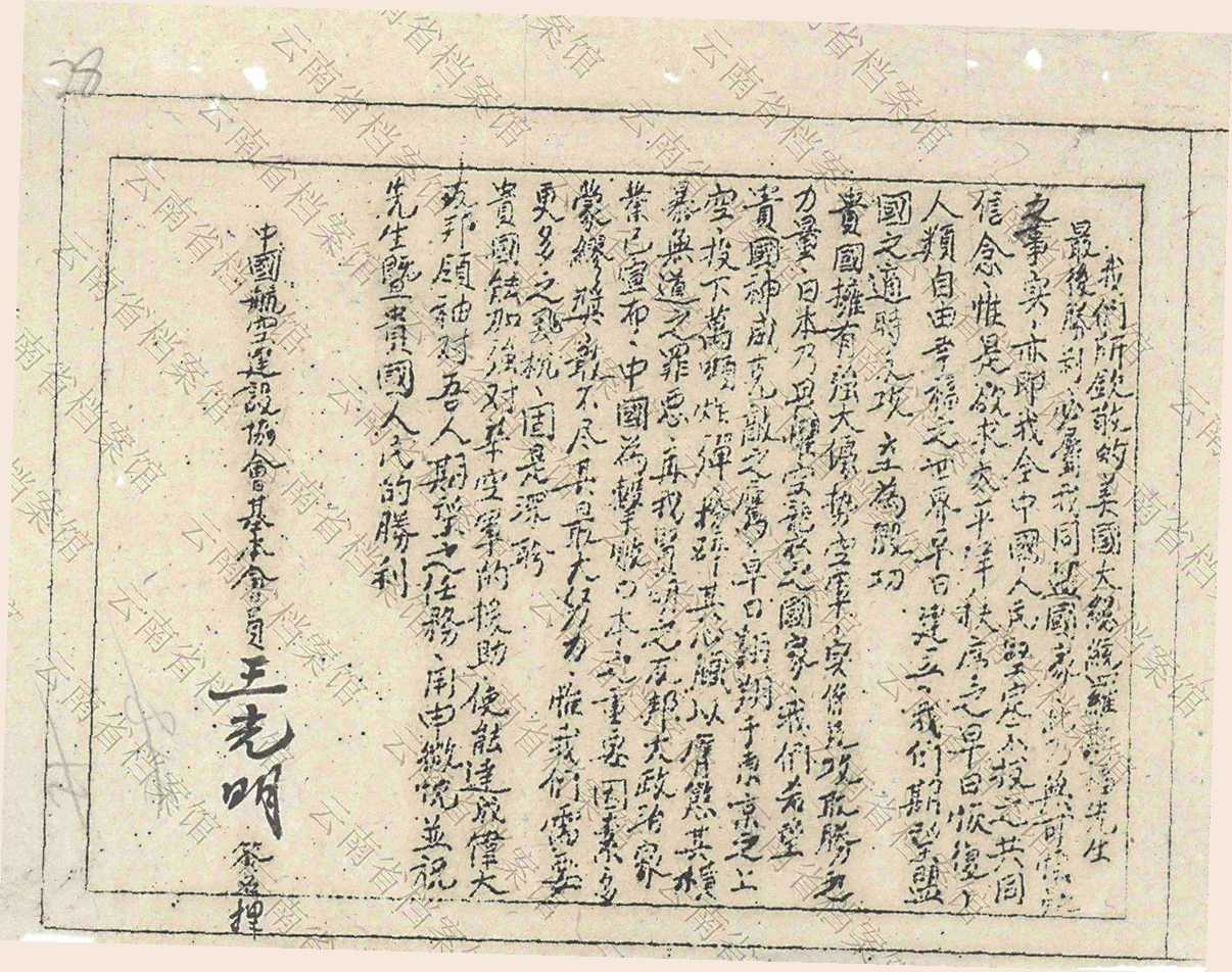 在云南省档案馆馆藏中,有这样一部分珍贵档案,不仅展现了飞虎队与中国军队并肩作战,为世界反法西斯战争与中国抗日战争胜利立下的丰功伟绩,也真实完整地记录了云南民众舍生忘死抢修无数机场;节衣缩食,全力保障飞行员供应;驼峰航线沿线各族人民倾情救助飞行员的战时故事。这些档案中的故事,是中美两国人民共同为世界和平而并肩战斗的典范,是传承中美人民友谊合作的动力。本报集纳推出飞虎队馆藏档案,再现这段珍贵历史。
