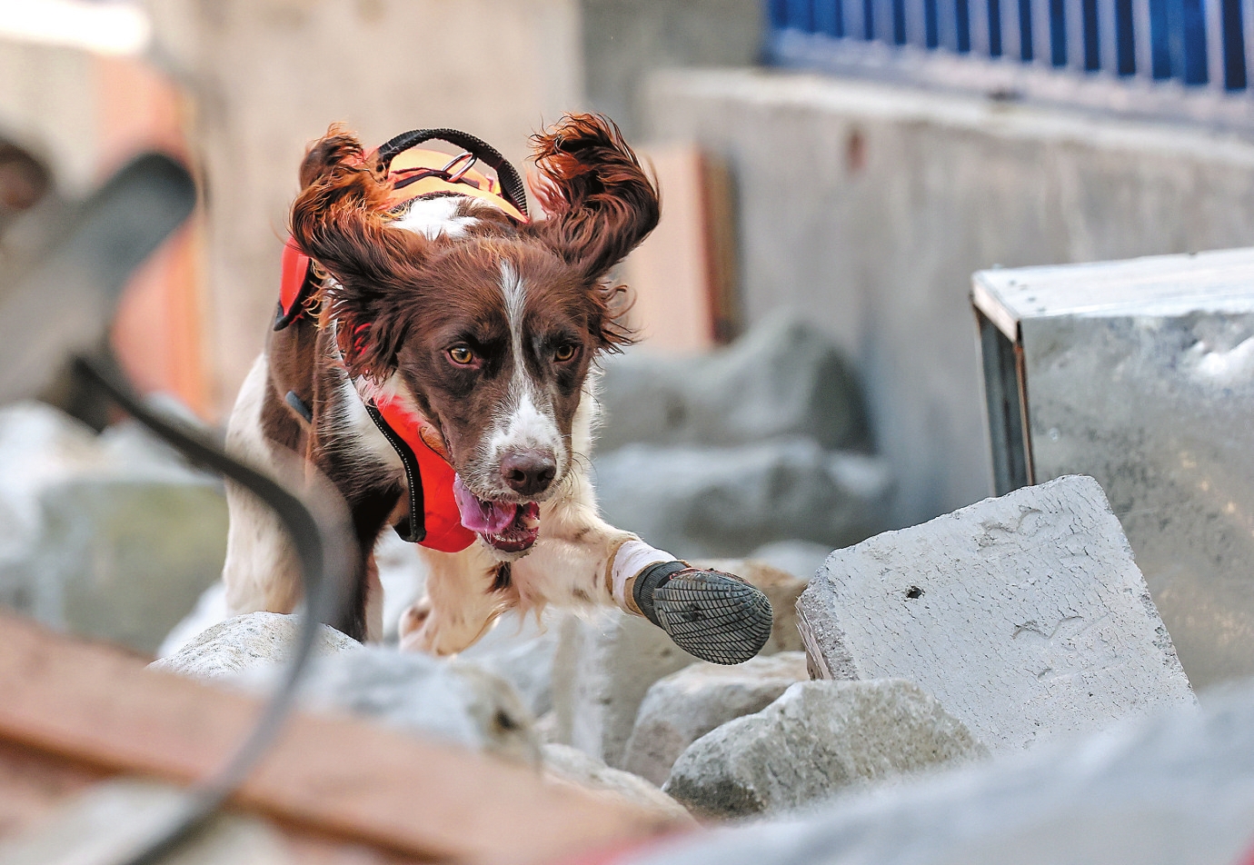 10月13日至15日,第七届全国消防搜救犬技术比武竞赛在山东济南举行,来自全国31个消防救援总队及森林消防队伍、南京训练总队共计330名训导员及256头搜救犬参加本次比赛。图为10月14日,参赛搜救犬在进行废墟搜救。