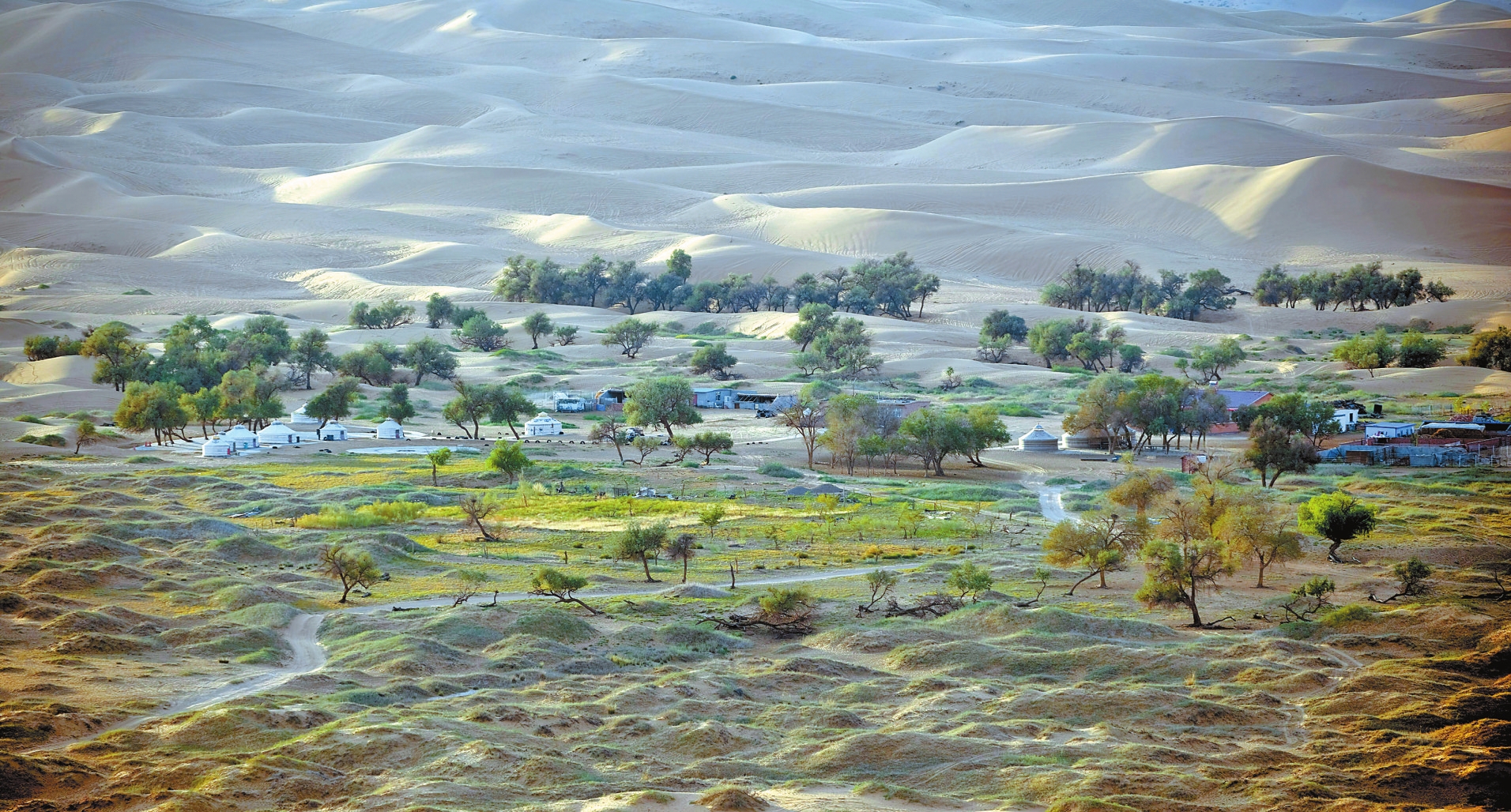 金秋十月,腾格里沙漠吸引不少游人前来观光。图为10月13日拍摄的内蒙古阿拉善左旗腾格里沙漠中的村庄。