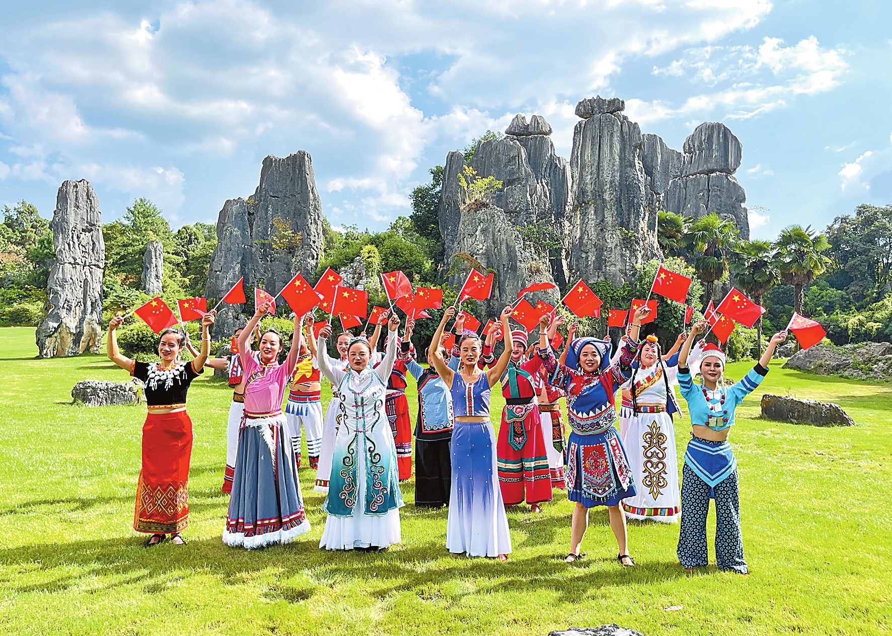 “手与手相牵,爱与爱相拥,你我的激情如大叠水飞扬,超越那巅峰,跨越那彩虹……都是姐妹弟兄,都有同一个梦,让阿诗玛的故乡飞扬雄风……”