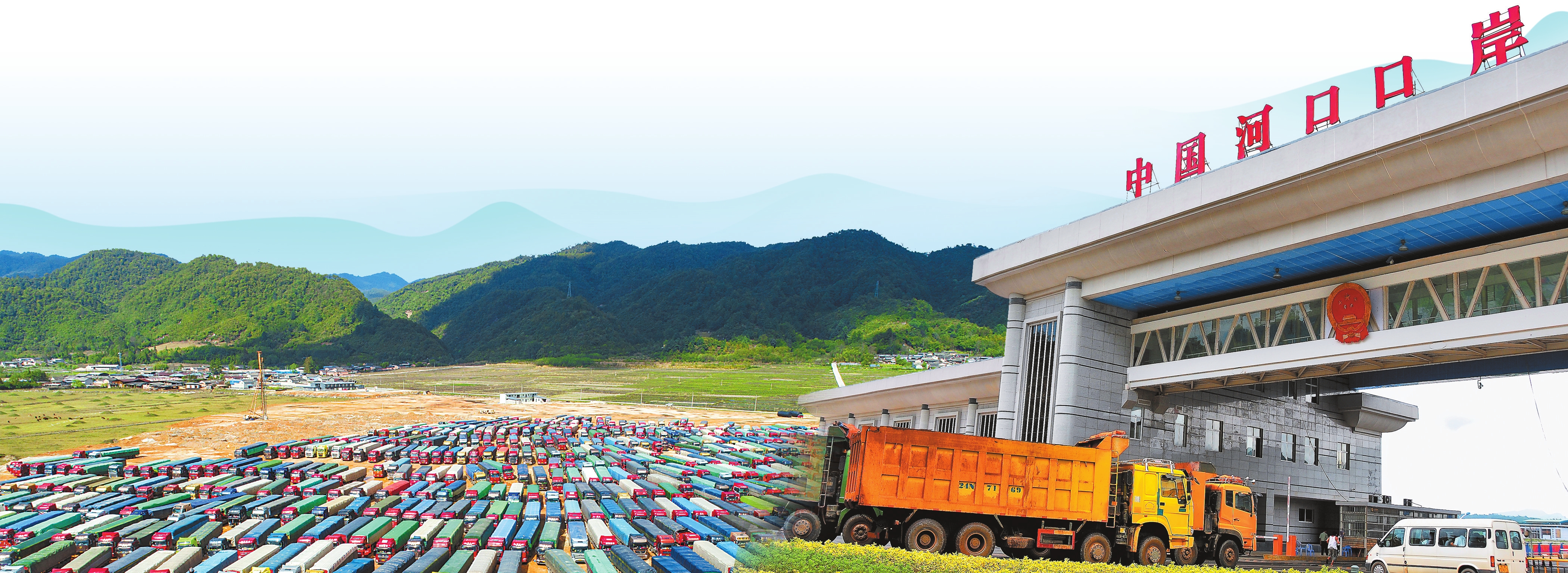 来到临沧孟定清水河口岸服务管理有限公司,运送着各类货物的大货车正排队出入境。从公司露台放眼望去,缅甸境内的群山蜿蜒,近处山腰下可以看见“中缅印度洋新通道·云南临沧陆路港”的红色大字。