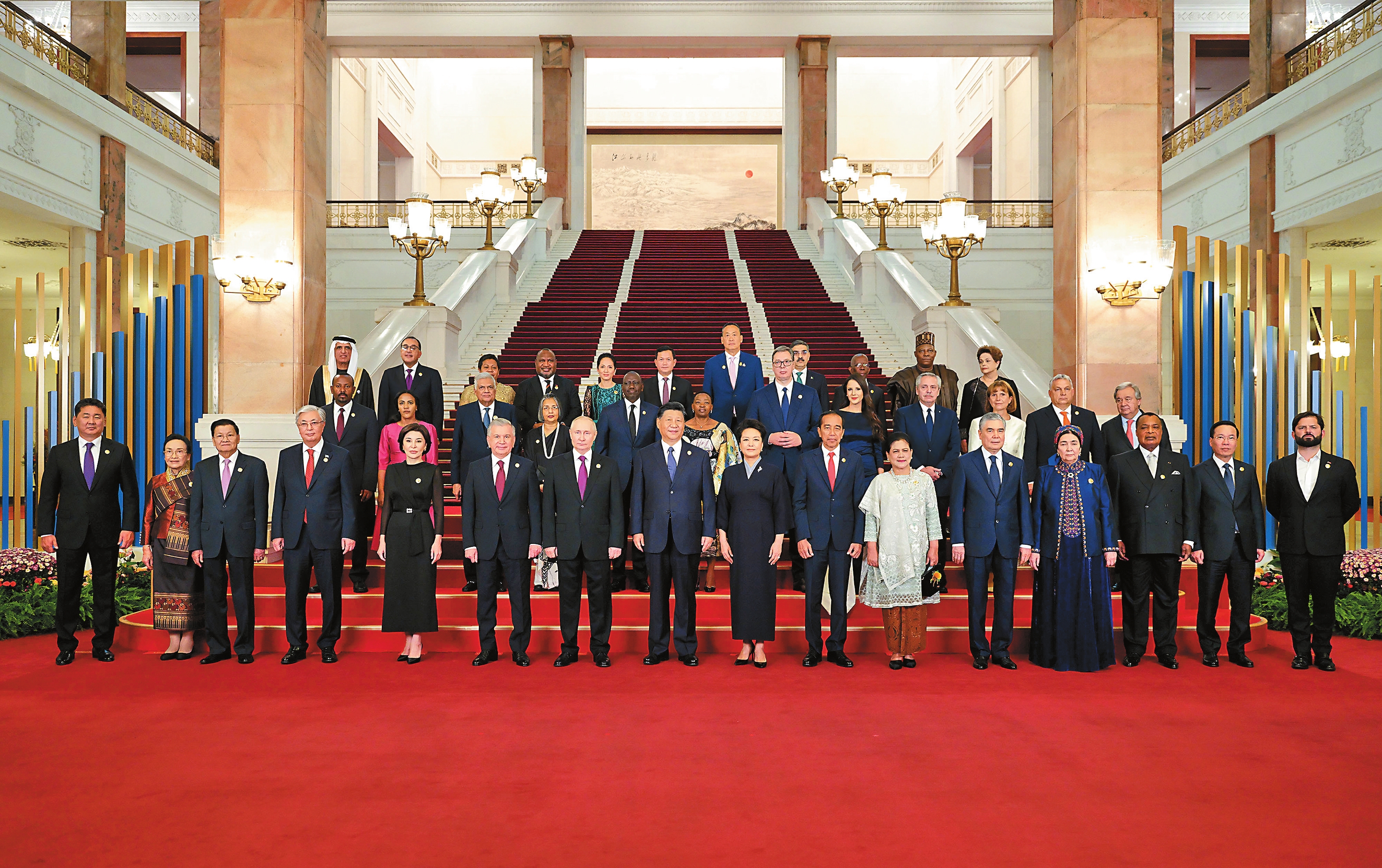 10月17日晚,国家主席习近平和夫人彭丽媛在北京人民大会堂举行宴会,欢迎来华出席第三届“一带一路”国际合作高峰论坛的国际贵宾。这是习近平和彭丽媛同国际贵宾合影留念。 新华社记者 李学仁 摄
