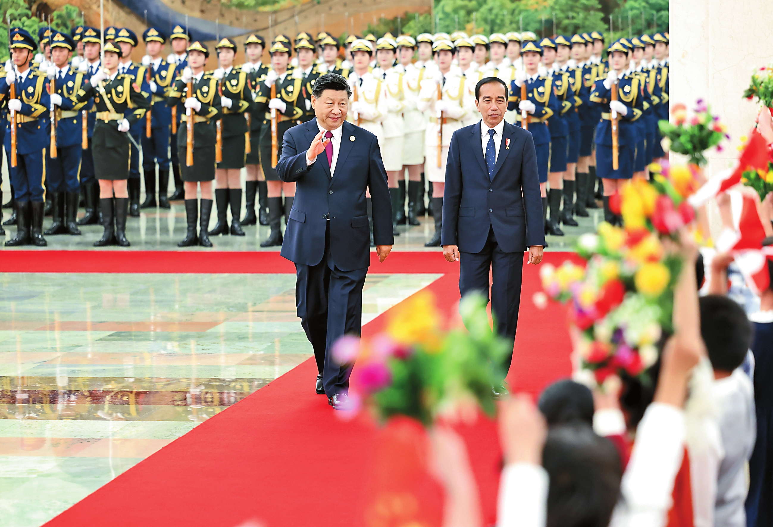 会谈前,习近平在人民大会堂北大厅为佐科举行欢迎仪式,陪同佐科检阅中国人民解放军仪仗队,并观看分列式。