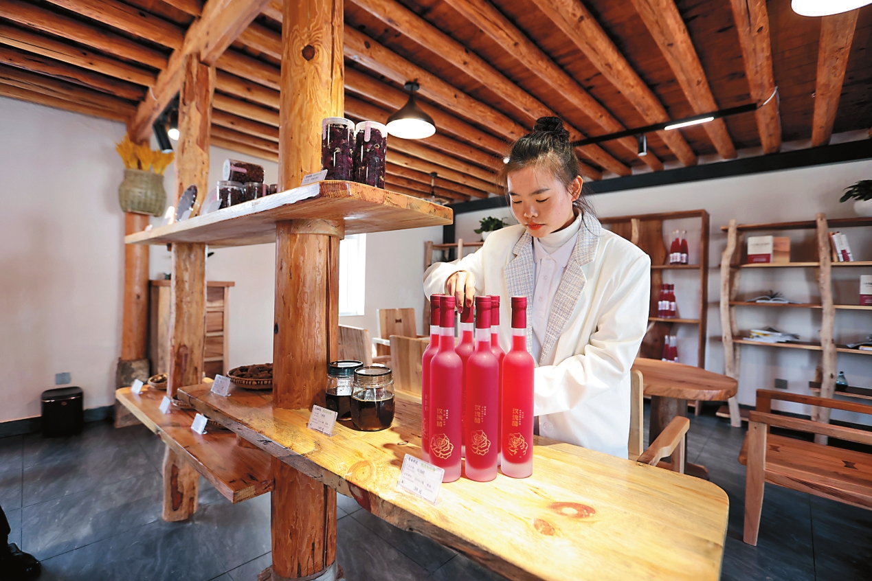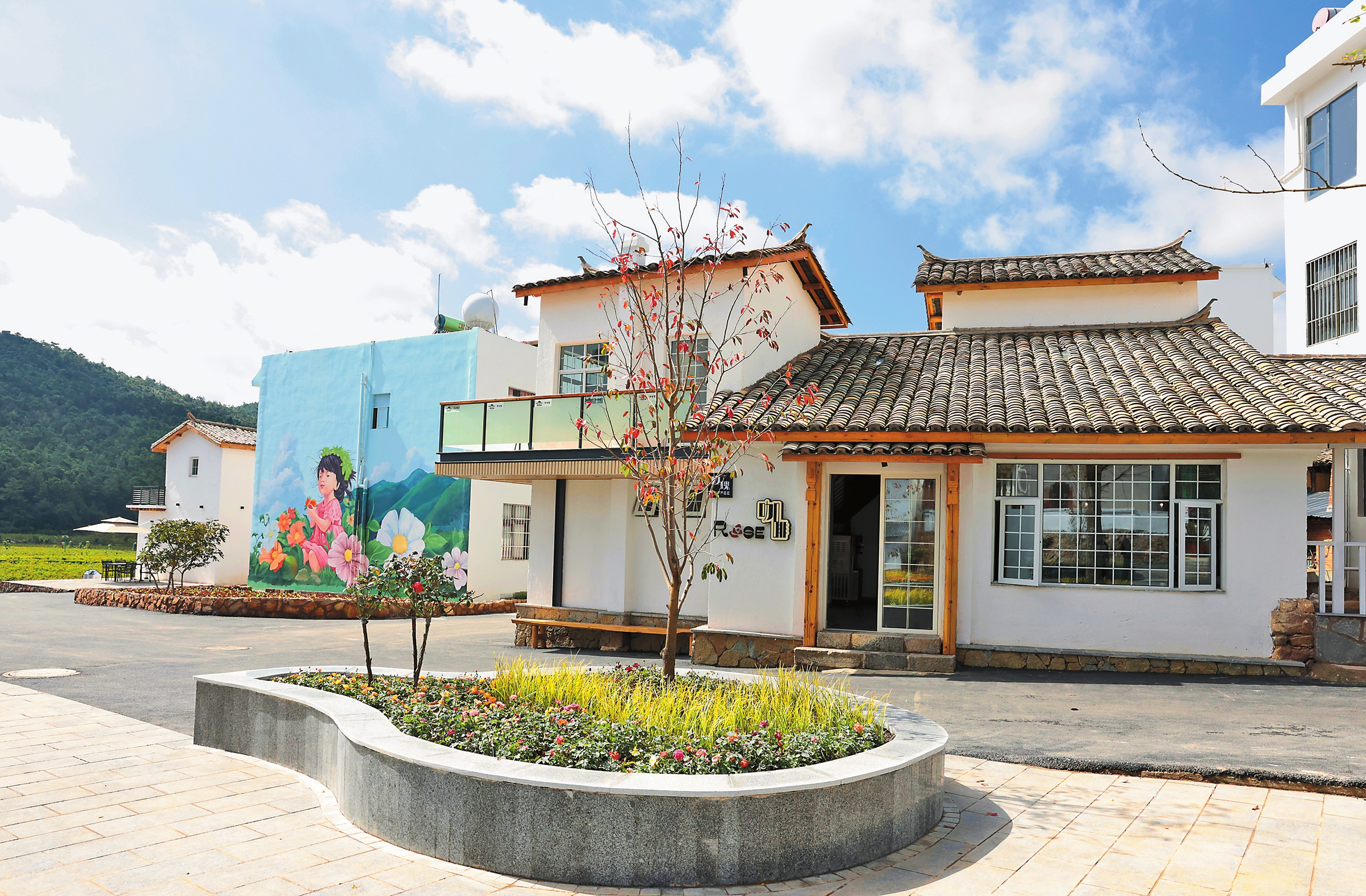 白墙灰瓦的小楼与土墙石瓦的老房相得益彰,古朴雅致的咖啡馆与小饭馆完美融合,栩栩如生的墙体彩绘与玫瑰花田遥相呼应,一幅乡味浓郁的美丽画卷随即铺开。近年来,曲靖市麒麟区升官屯村整合闲置土地,采取“党建+合作社+村民+电商”模式,发展食用玫瑰花产业,开发出玫瑰主题的工艺品、伴手礼等系列文创产品,形成集采摘、观光、餐饮、娱乐于一体的农文旅融合发展模式,拓宽了村民致富路。本报记者 陈飞 摄