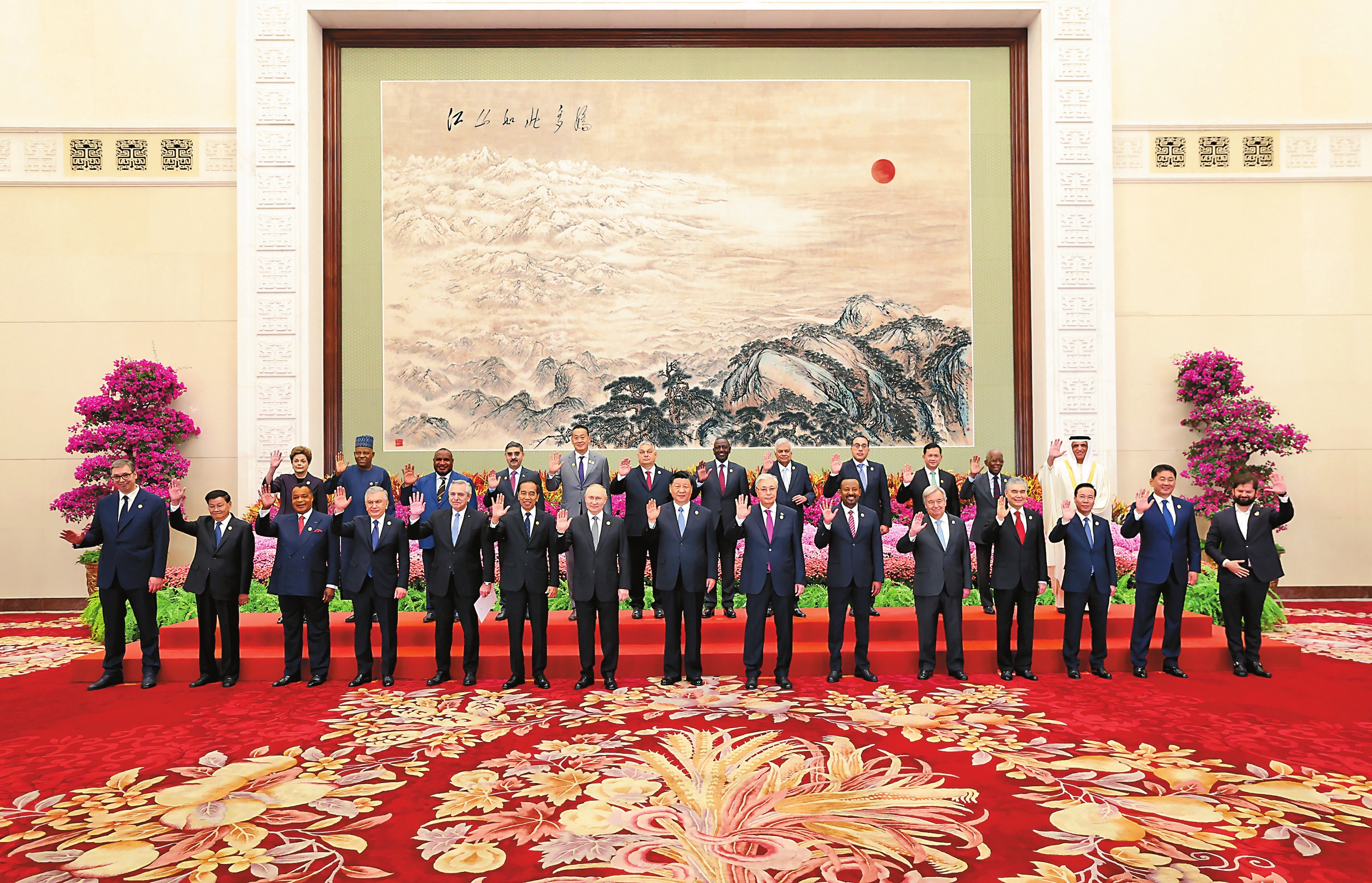10月18日上午,国家主席习近平在北京人民大会堂出席第三届“一带一路”国际合作高峰论坛开幕式并发表题为《建设开放包容、互联互通、共同发展的世界》的主旨演讲。这是会前,习近平同出席高峰论坛的外国国家元首、政府首脑和国际组织负责人等国际贵宾集体合影。 新华社记者 黄敬文 摄