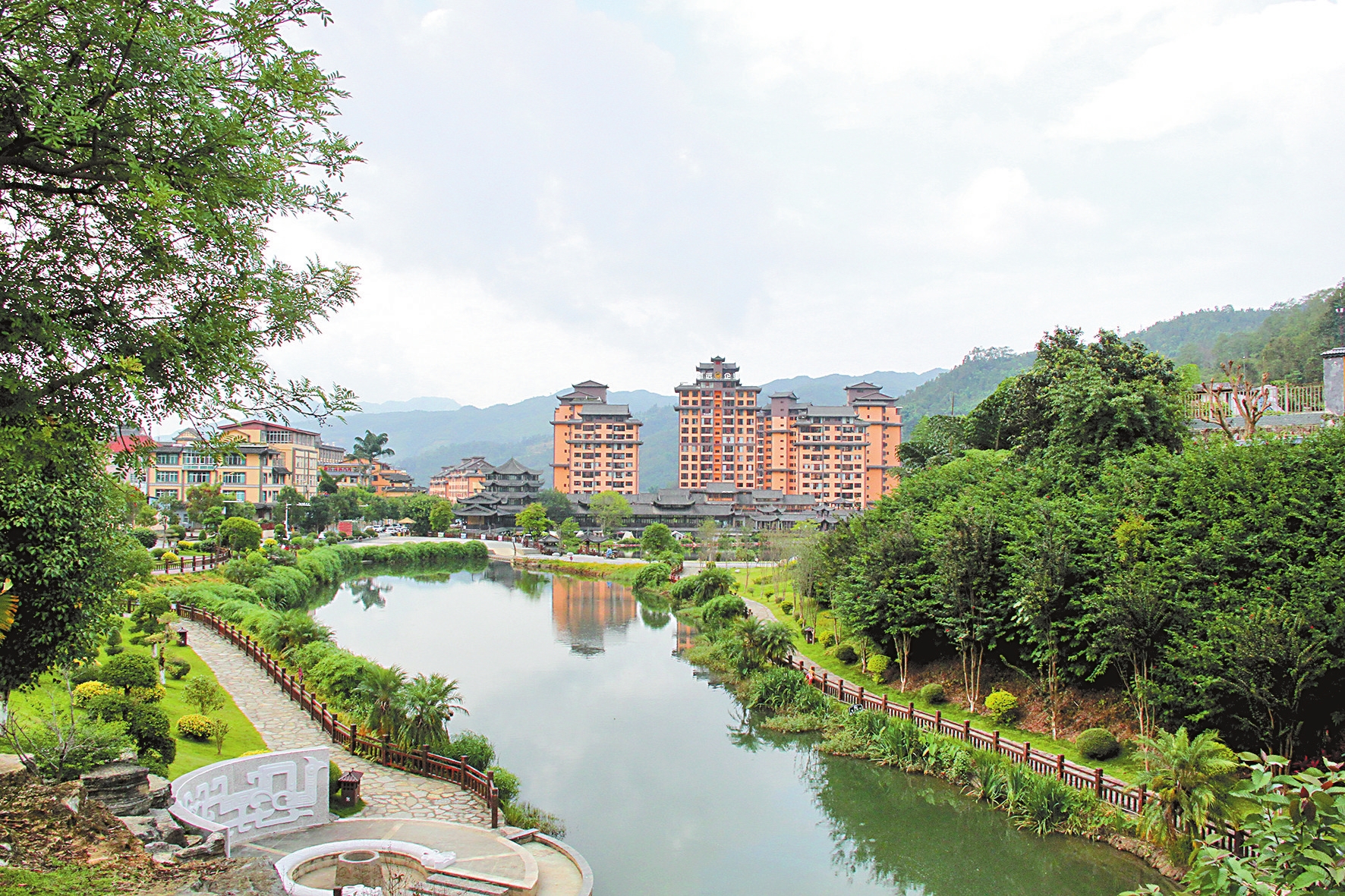 坚持生态惠民、生态利民、生态为民的工作导向,屏边县充分利用现有的自然资源优势和浓郁的苗族文化元素,建设城市与周边山水空间联通的生态廊道网络,将坡屋顶、小青瓦、米黄墙等苗族文化元素融入城市规划建设,实现森林围城、清水活城、花木映城、苗文化靓城的目标。通过建立各式亲水景观、生态湿地、公园绿地、透水路面等项目,促进雨水资源的利用和生态环境保护,形成独特新颖的城市景观。
