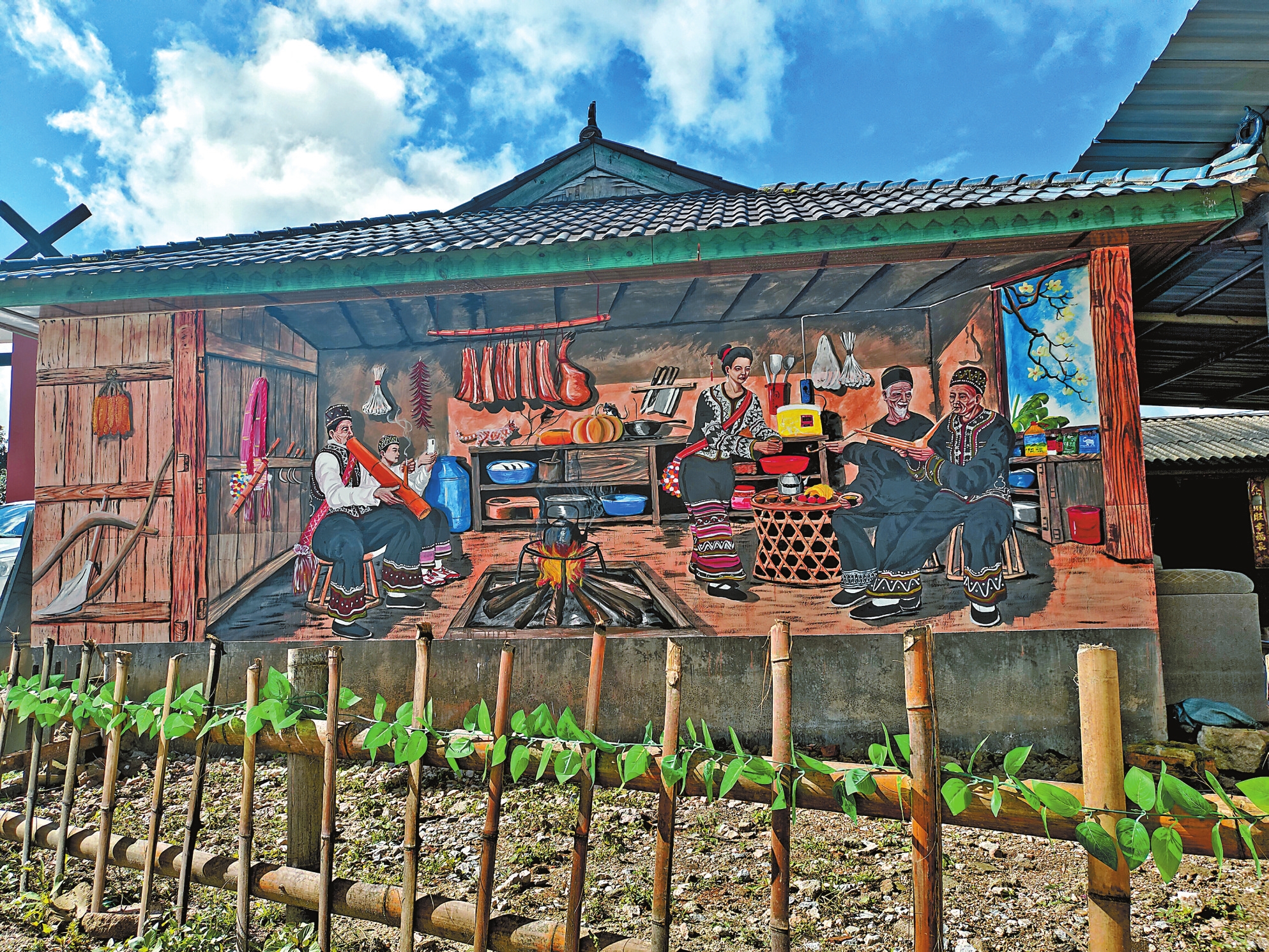 墙画内容主要描述拉祜族生产生活、民风民俗、民族服饰等,生动展现了拉祜群众淳朴善良、热情好客、勤劳致富的精神风貌。村民们笑着说:“如今,我们的房子上画上了好看的图画,老旧的墙壁焕然一新,而且保存时间长,我们特别喜欢。”