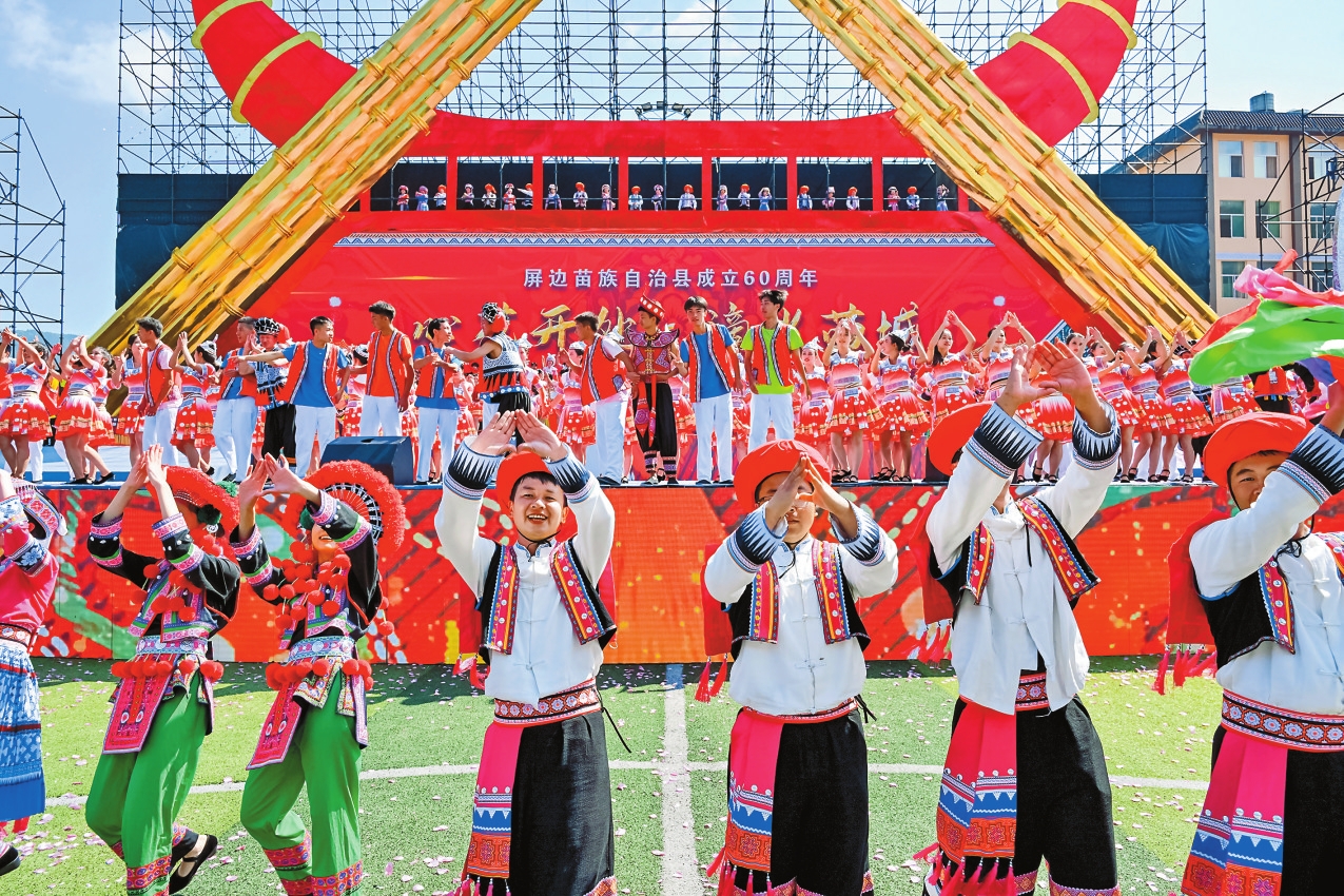 上午9时,伴随着欢快的乐曲声,7个乡镇代表队入场展演,展现屏边苗族自治县60年拼搏进取和各族儿女感恩奋进的精神风貌。随后,以“心花开处 滴水苗城”为主题的屏边县成立60周年庆祝大会文艺演出正式上演。文艺演出以生态文明建设排头兵、民族团结进步示范区、面向南亚东南亚辐射中心三个定位为指导思想,分为绿水青山、石榴结籽、山连着海3个篇章,全面展现了60年来屏边县经济社会翻天覆地的变化。