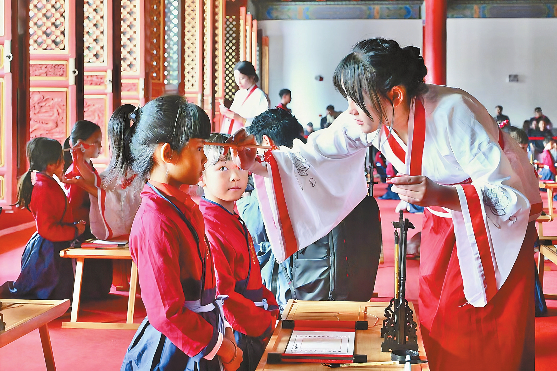 10月21日,五华区“护星暖心·国梦共筑”护国街道民族团结进步示范建设项目——“开笔识文、礼润童心”活动在昆明文庙举行。来自磨憨镇尚勇村的30名小学生与五华区的30名小学生一同正衣冠、拜师恩,在庄严的开笔礼中开启人生新起点。
