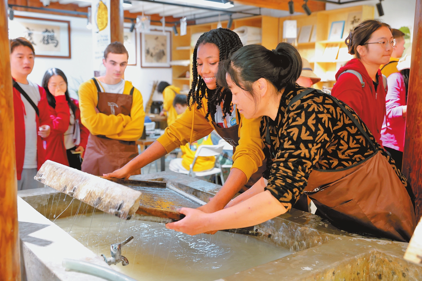 来自哥斯达黎加赛区的江近月在喜洲古镇体验到了古法造纸的神奇。历经撕料、捶浆、调浆、造纸、晾纸等多个环节,一张充满大理浪漫气息的花草纸从江近月手中诞生。“中国的造纸术是一项改变世界的伟大发明,但今天我学习到的造纸技术与我想象的很不一样,加入花瓣的纸太美了,大理将造纸变成了一种艺术!”