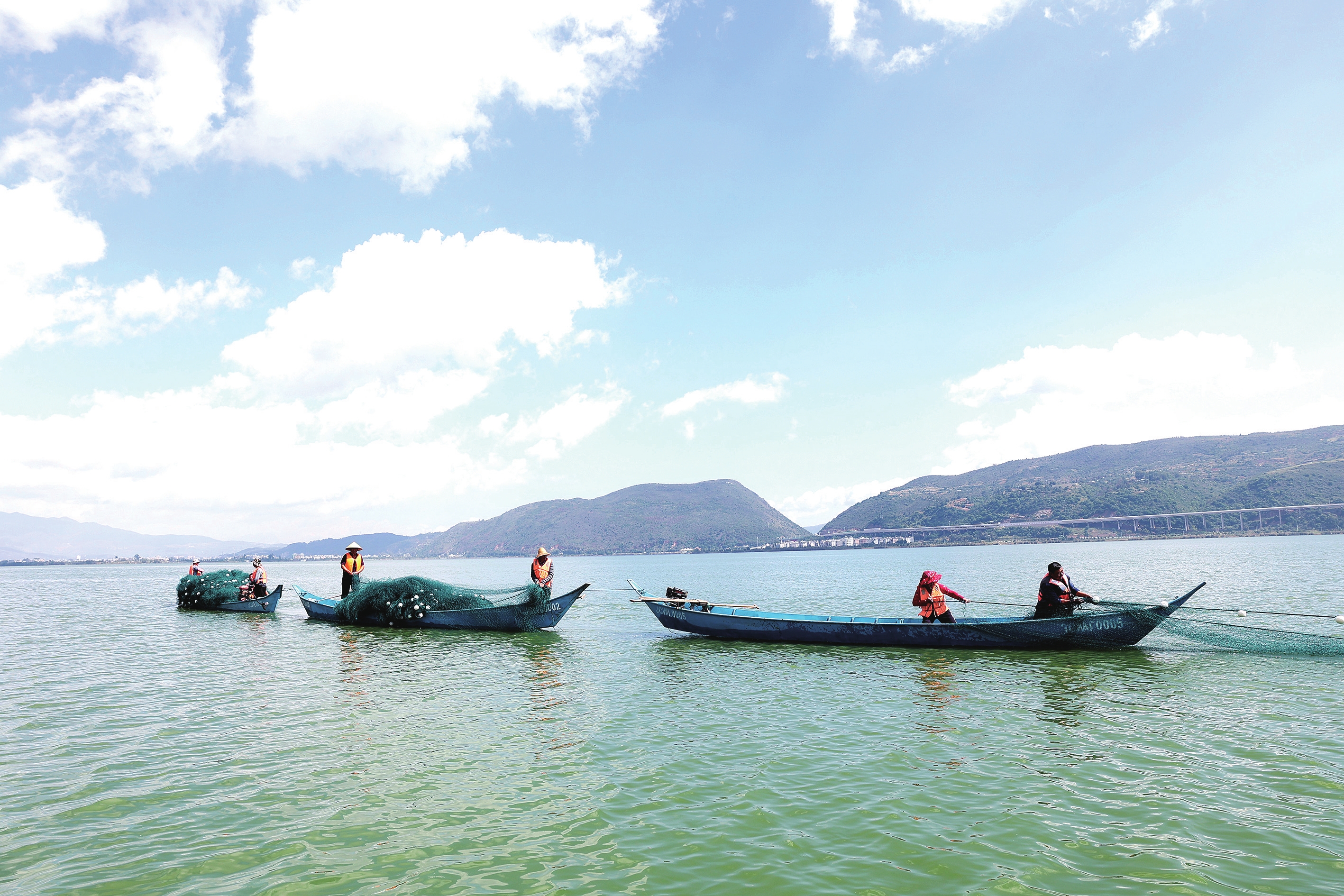 “星云湖鱼类生态调控工作正式启动,鸣炮!”上午9时,伴随着响亮的鸣炮声,5只载满渔网的渔船如离弦之箭,迅速到达星云湖麻地咀,工作人员有条不紊地向湖面撒下渔网。