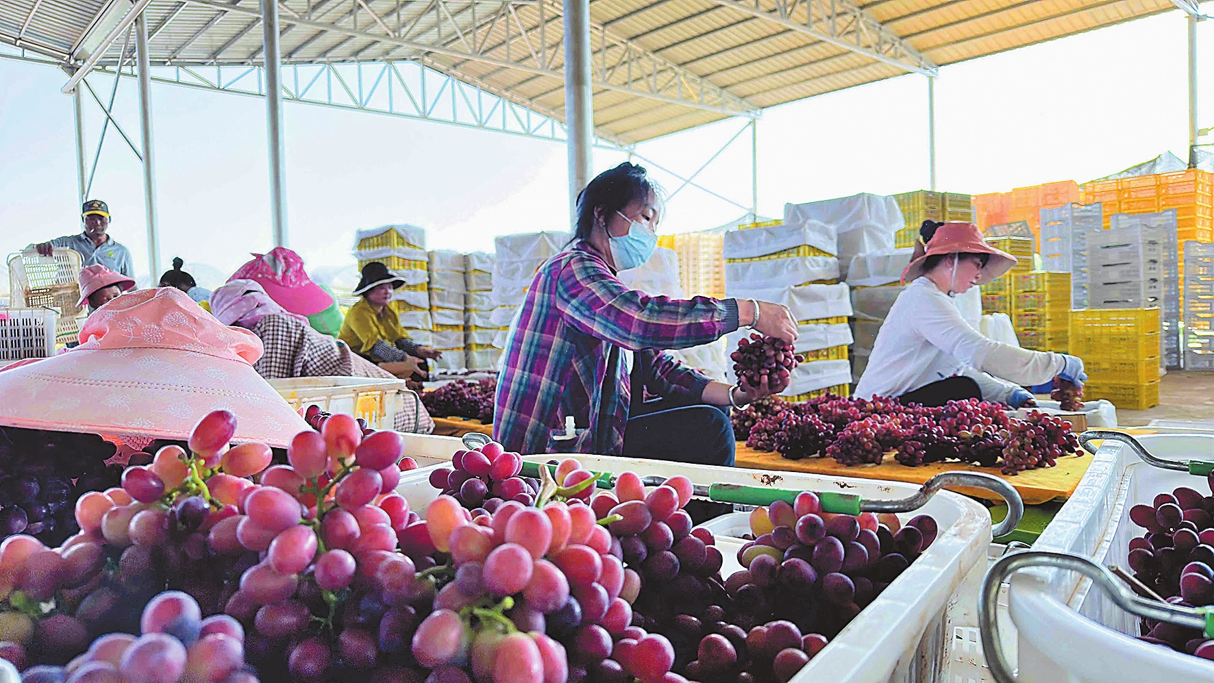 早上9点,元谋县果然好农业有限公司基地里,当天采摘的葡萄已经装好车,两天后就能端上上海市民的餐桌。公司业务经理陈太江介绍,元谋出产的水果品质好,公司种植的葡萄、牛油果、释迦果等水果销量一直很好。企业凭借元谋得天独厚的气候资源发展产业,同时也以土地流转、入股分红、就地就业等形式反哺当地农户,实现增收致富。企业在招工用工时优先考虑县内人员特别是基地所在地的农民工,确保群众不出村、不出乡即可实现就地就近就业。2014年以来,企业为480余人提供长期就业岗位,季节性用工1.4万余人次,年支付工资2680万元。