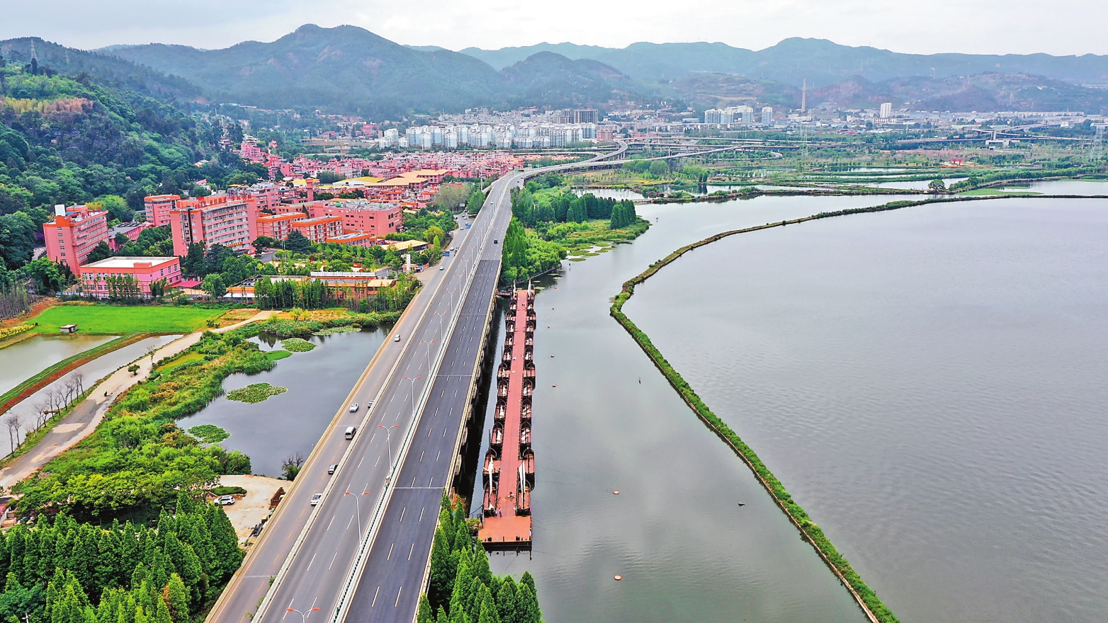 远眺滇池,一条“翡翠项链”映入眼帘。