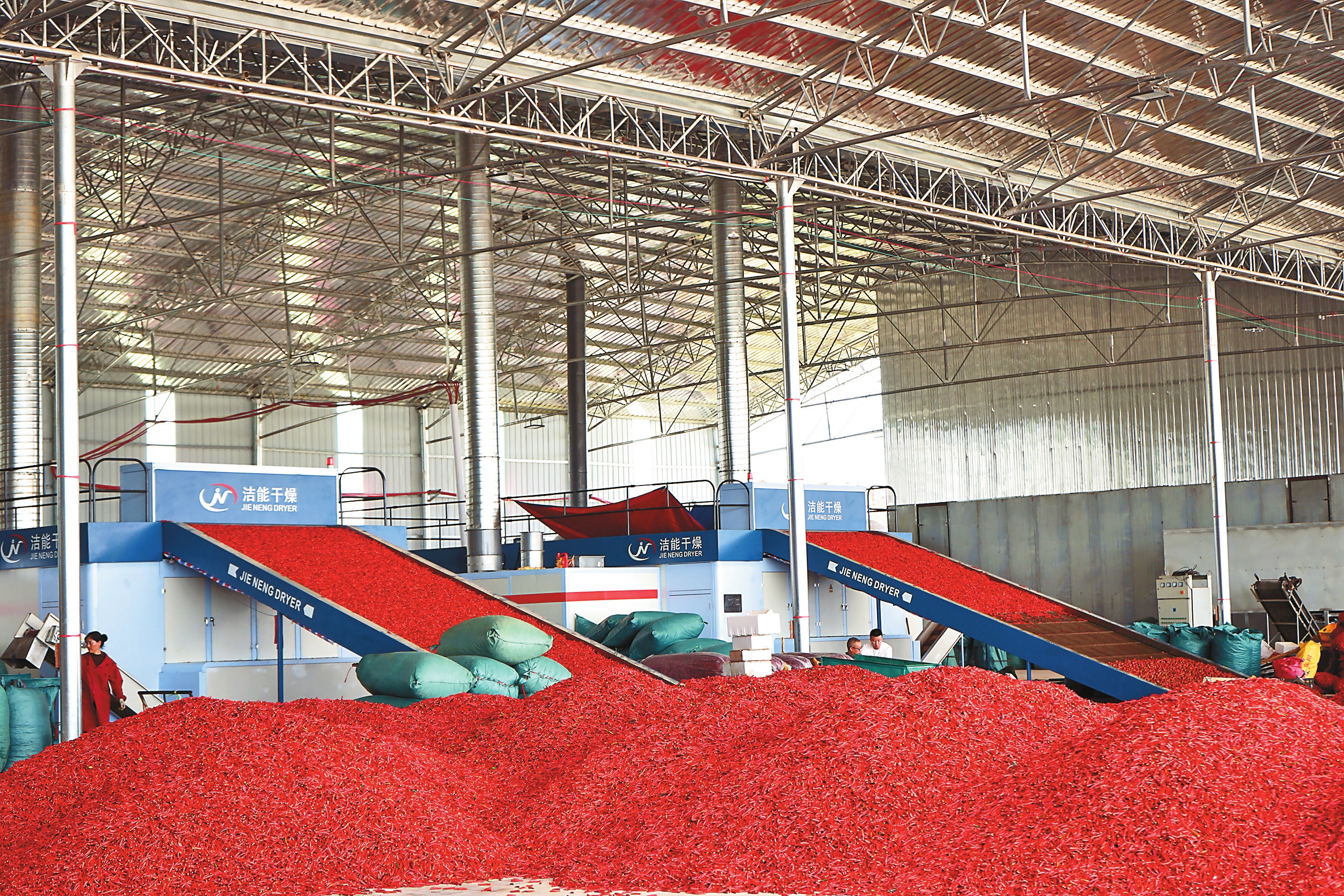 在位于砚山县稼依辣椒城的亚飞蔬菜种植农民专业合作社内,火红的辣椒堆积如山,辣椒烘干线轰鸣运作、剁椒生产线高速运转,包装后的辣椒成品被整齐码放在仓库里,即将发往国内外各地。
