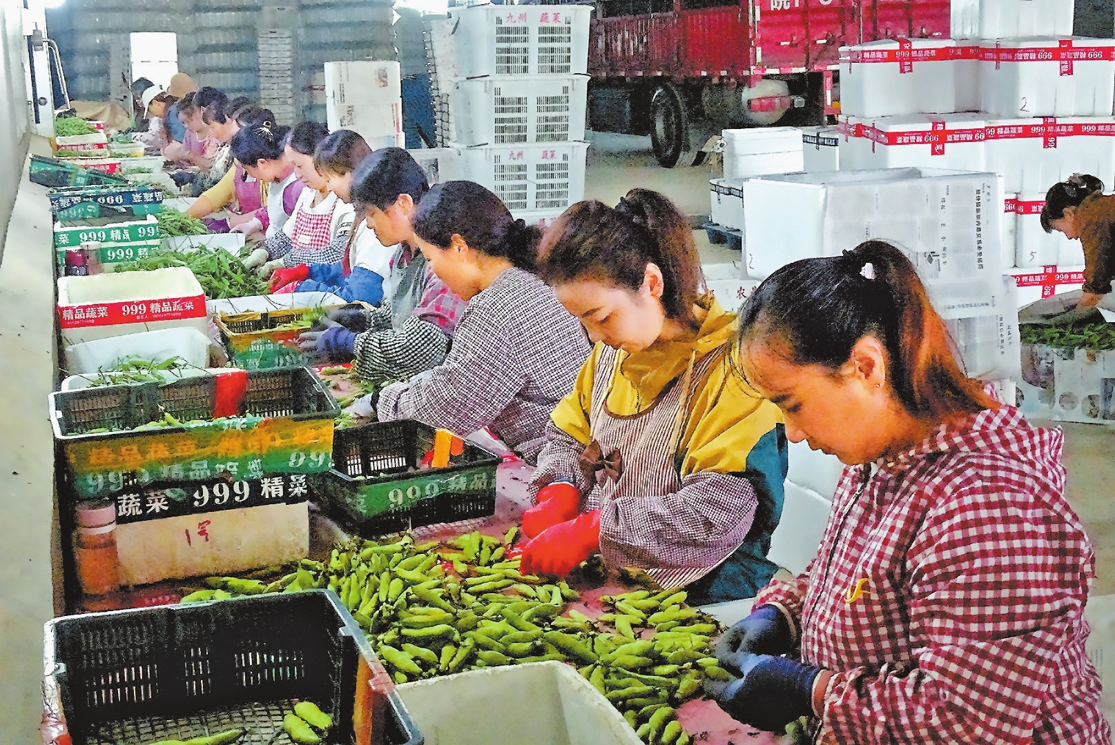 眼下,祥云县刘厂镇烤烟套种的1.2万亩秋豌豆进入采收期。刘厂镇以蔬菜为主导产业,建成4个“万亩种植基地”,被认定为省级“一村一品”专业镇。其中,烤烟套种秋豌豆1.2万亩、蚕桑2万亩、特色林果2.3万亩、蔬菜7.3万亩。占地20亩的祥云泰兴冷链物流中心配置了先进的冷链设施设备,年处理蔬菜预冷4万多吨,实现蔬菜产品分级、包装、营销冷链化运行。图为祥云泰兴冷链物流中心的务工群众分拣包装秋蚕豆、秋豌豆。本报记者 段苏航 通讯员 冯雪娥 摄
