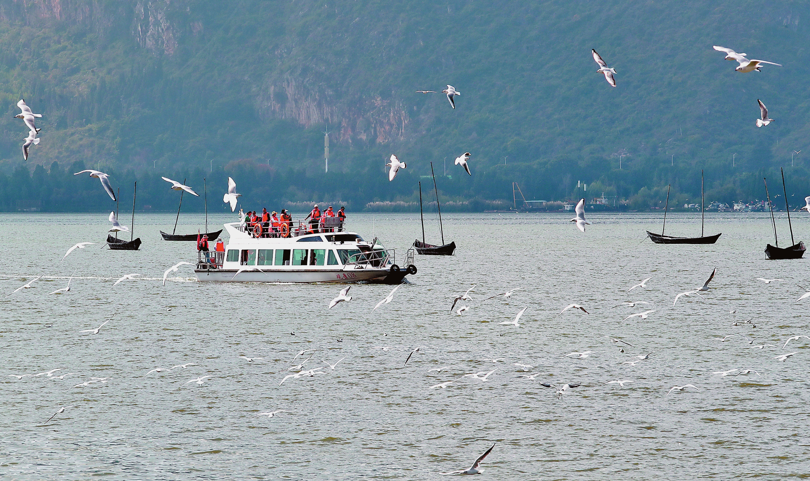 10月29日,来春城昆明越冬的红嘴鸥聚集在滇池大坝草海水域觅食,吸引大批市民游客前来观鸥喂鸥。目前,抵达昆明的红嘴鸥主要集中在滇池大坝至龙门村沿线水域,数量超过5000只,进入11月,红嘴鸥大部队将会抵达昆明。
