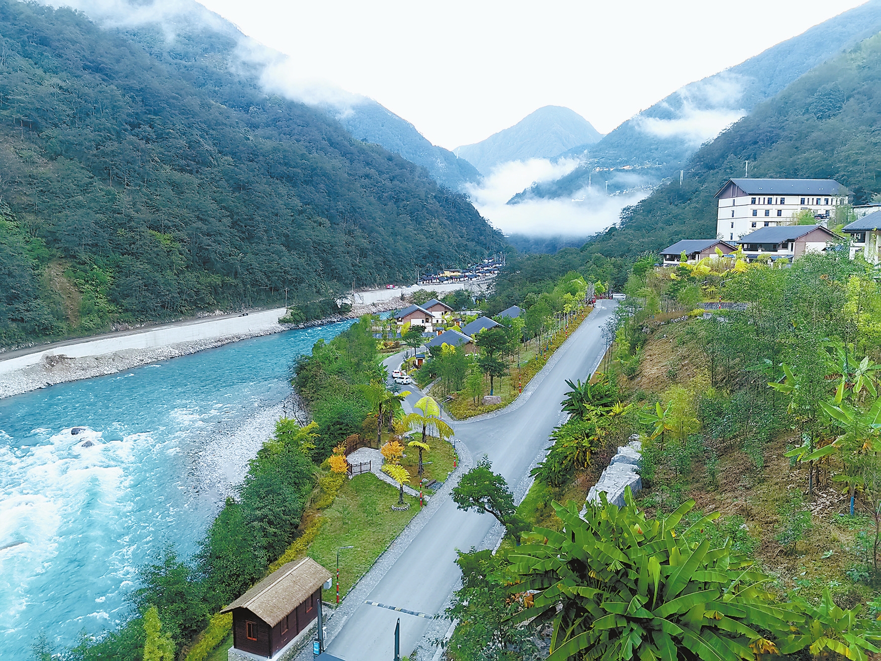 深秋,贡山独龙族怒族自治县独龙江乡孔当村普卡旺河清澈见底,如翡翠般透绿静美,与远处的青山茂林和村寨构成了一幅天然画卷。