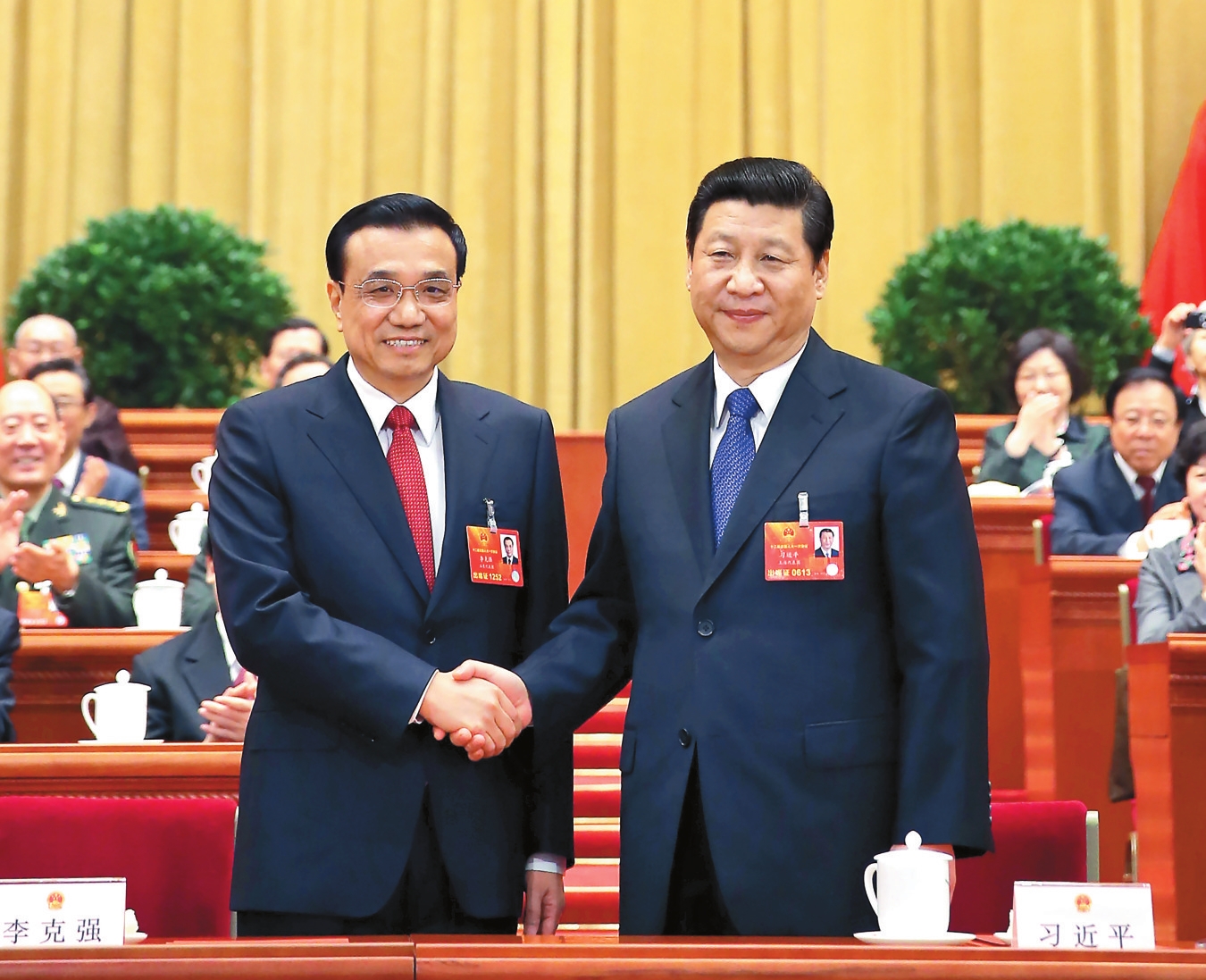 图1:2013年3月15日,第十二届全国人民代表大会第一次会议在北京人民大会堂举行第五次全体会议。会议经过投票表决,决定李克强为中华人民共和国国务院总理。这是习近平同志和李克强同志亲切握手。新华社记者 兰红光 摄