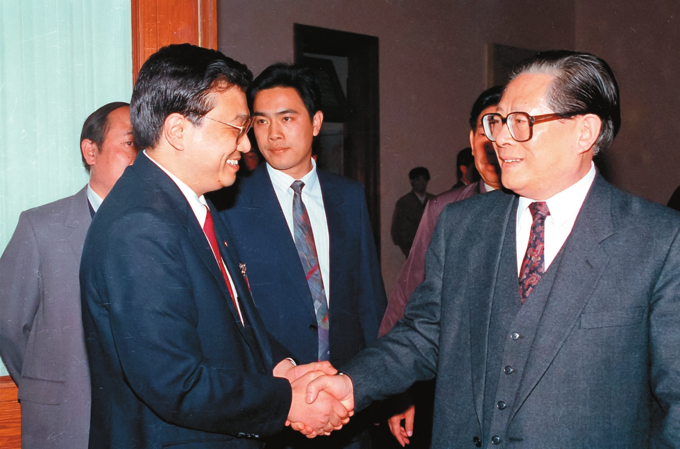 图2:1993年5月3日下午,中国共产主义青年团第十三次全国代表大会在北京人民大会堂开幕。在5月3日上午的预备会议后,举行第一次主席团会议,推选李克强等同志为主席团常务主席。这是江泽民同志与李克强同志握手。 新华社记者 郭占英 摄