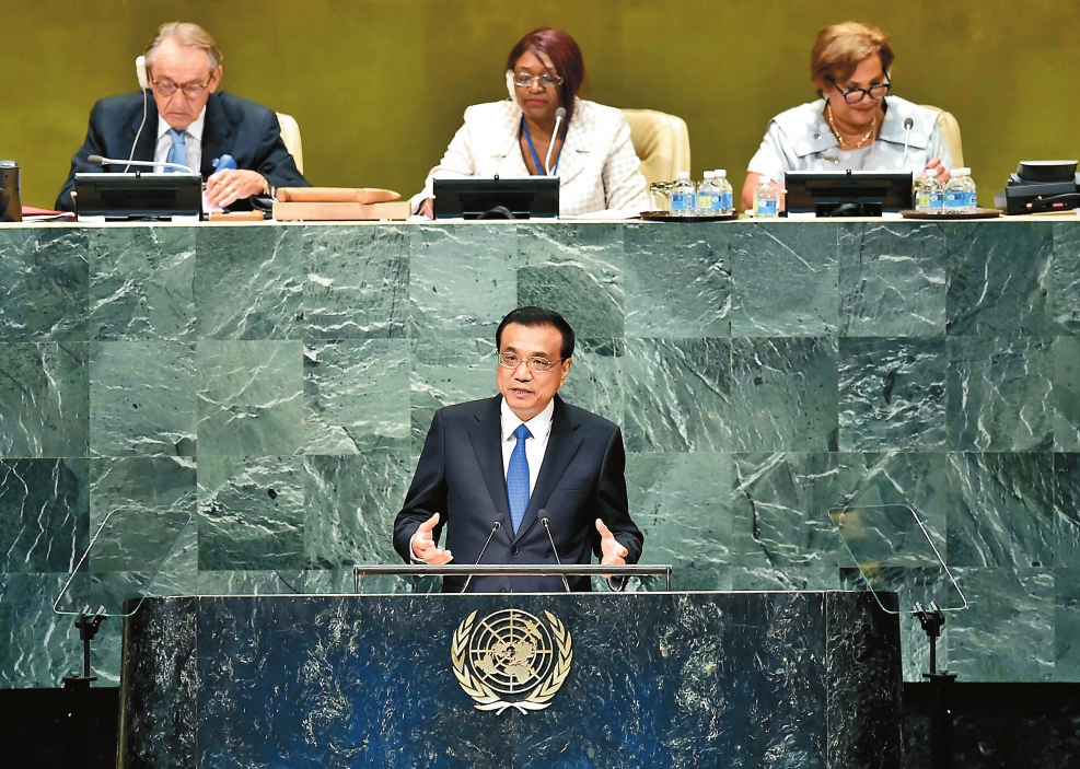图11:2016年9月21日,李克强同志在纽约联合国总部出席第71届联合国大会以“可持续发展目标:共同努力改造我们的世界”为主题的一般性辩论并发表题为《携手建设和平稳定可持续发展的世界》的讲话。 新华社记者 李涛 摄