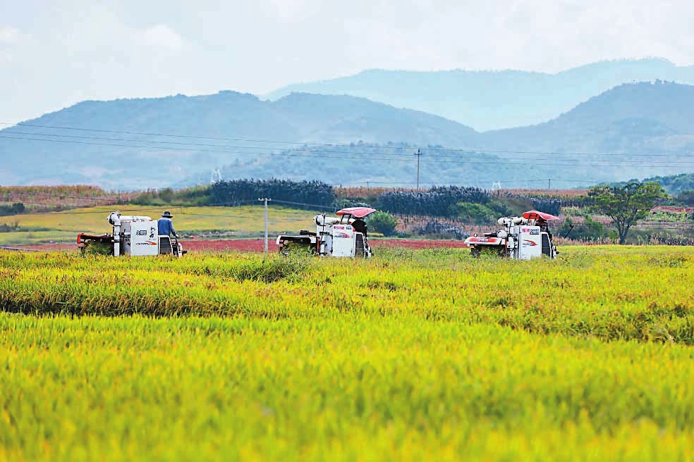 近日,开远市中和营镇响水村委会万亩高标准粮烟协同发展示范项目核心区种植的旱地水稻迎来丰收。