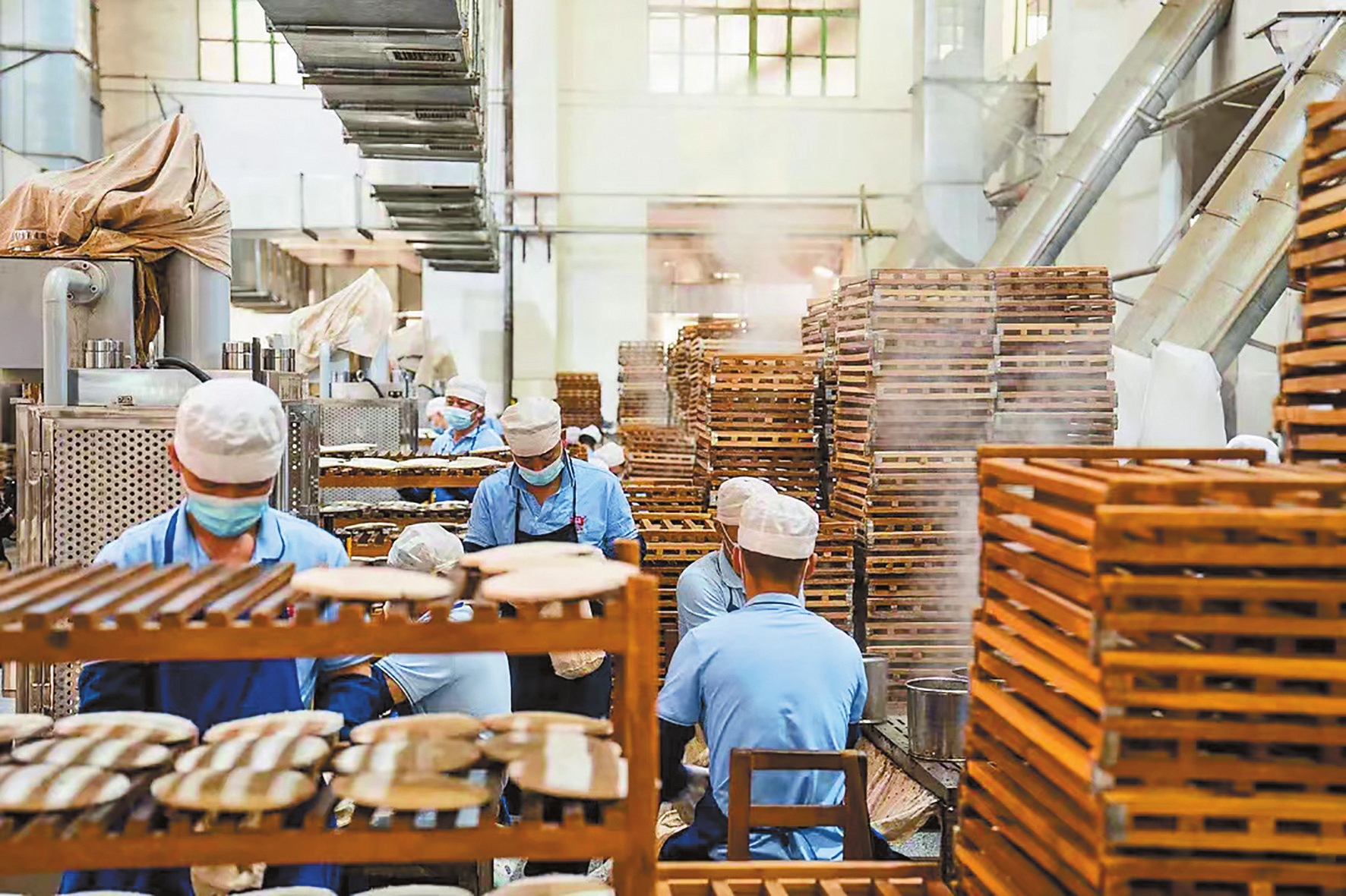 在勐海茶厂生产车间,工人在“云雾”蒸腾中工作。经过熟茶自动潮水生产线完成潮水工序后,绵延不断的茶叶原料从2楼直下到达自动称量流水线,工人们有序地蒸茶、揉茶、压饼、摊凉、解袋、质检……