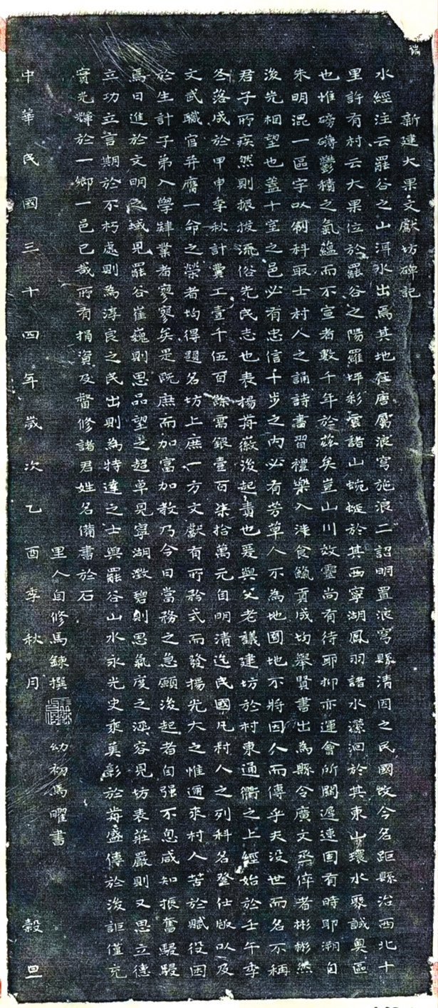 《新建大果文献坊碑记》是马曜的四哥马鍊所撰,是为其家乡大理洱源茈碧湖镇大果村所建的地方文献坊而撰写之碑记。马鍊(1898—1961)曾做过云南省参议员,据马曜撰《马鍊先生传略》所记,马鍊“平时手不释卷,好藏书,堪称儒商,建国后曾协助云南省历史研究所整理《清实录》等有关文献资料,受到好评”。