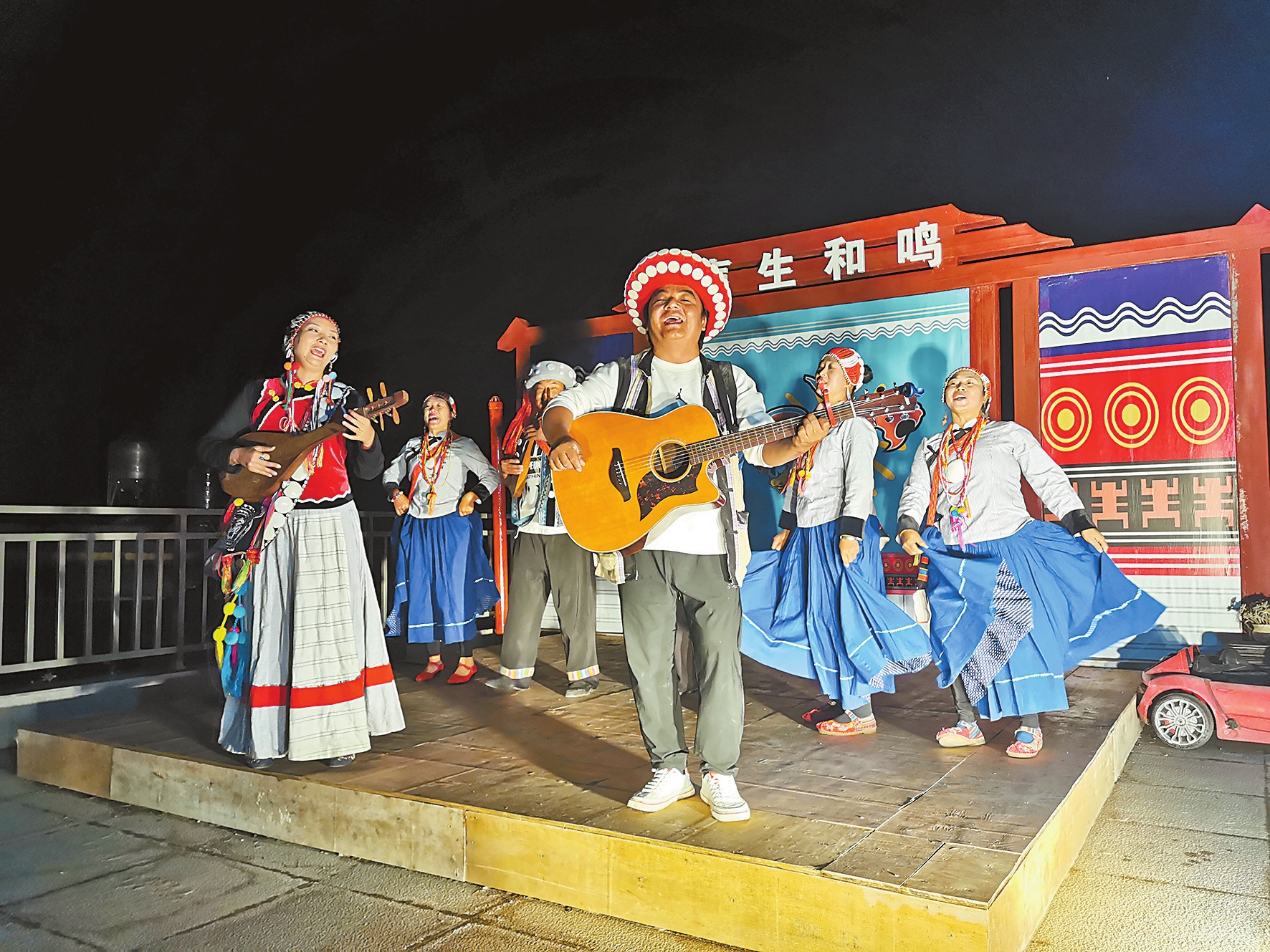 “我在花开的六月,和你看山花浪漫,我用一千朵野花,为你做花的衣裳,挂在七莲湖上……”夜晚,传统怒族民居江家小院里,一首《七莲湖》飘扬在夜空,拉开了“老姆登之夜”怒族非遗文化展演的序幕。