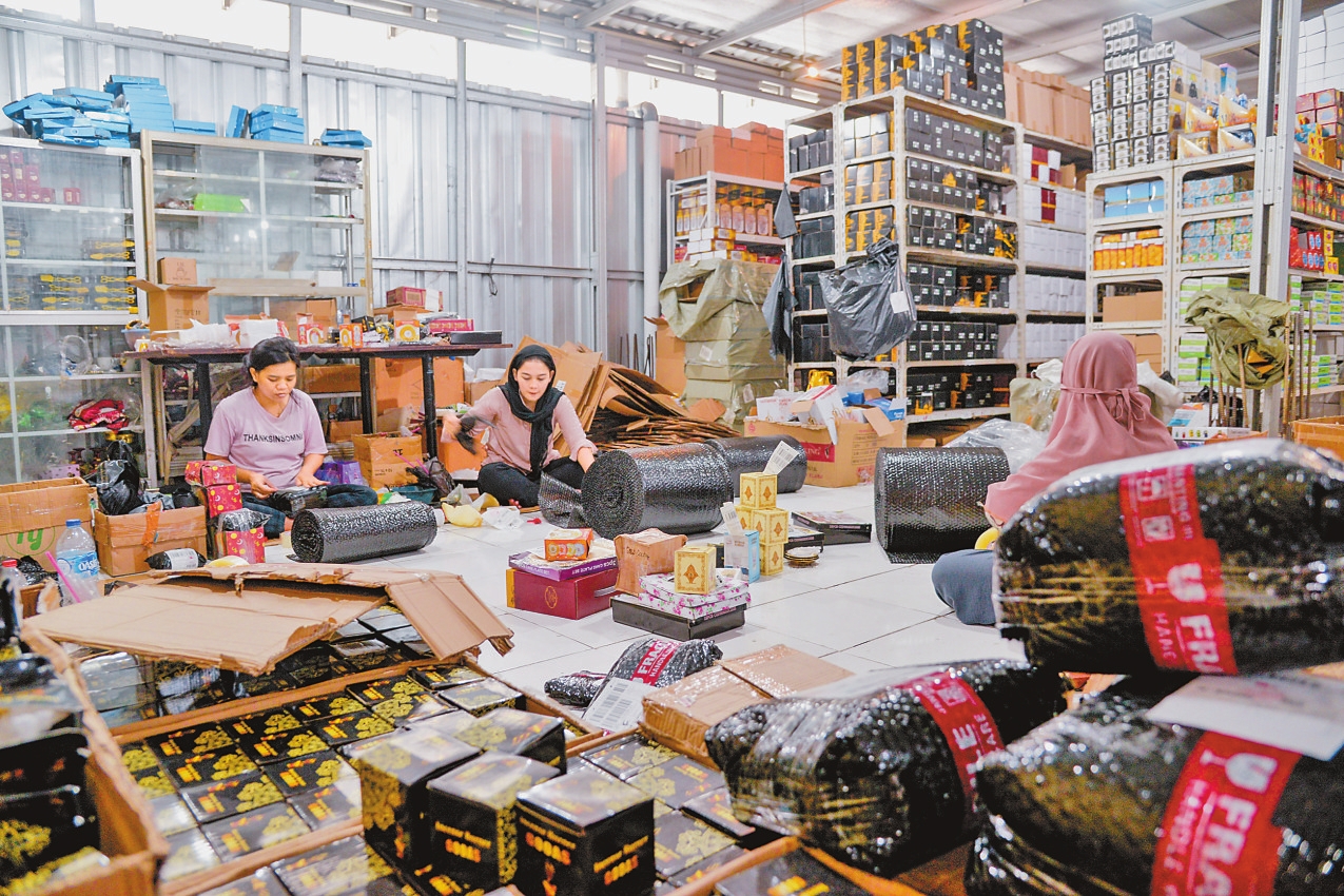 图为11月10日,在印度尼西亚雅加达,“美丽珍珠商店”员工在“双十一”购物节期间打包网购订单包裹。新华社记者 徐钦 摄