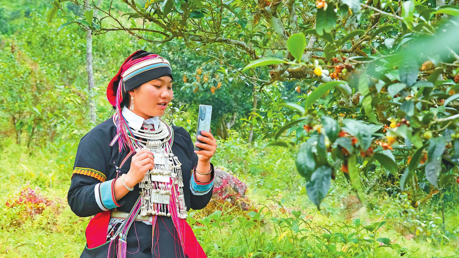“以前跟阿妈上山采茶,口渴时,阿妈总会采摘一片鲜叶放入我的嘴里。一边走一边咀嚼,苦尽甘来,不仅解渴,还有满满的幸福。”这一刻,身着传统瑶族五彩服饰,戴满精巧细致白银饰品的邓金仙正通过社交媒体直播平台,大方娴熟地与全国各地的网友交流互动,分享着孩提时的小确幸。这一刻,通过她,外面世界找到了诗与远方,古树茶叶也走出了大山。