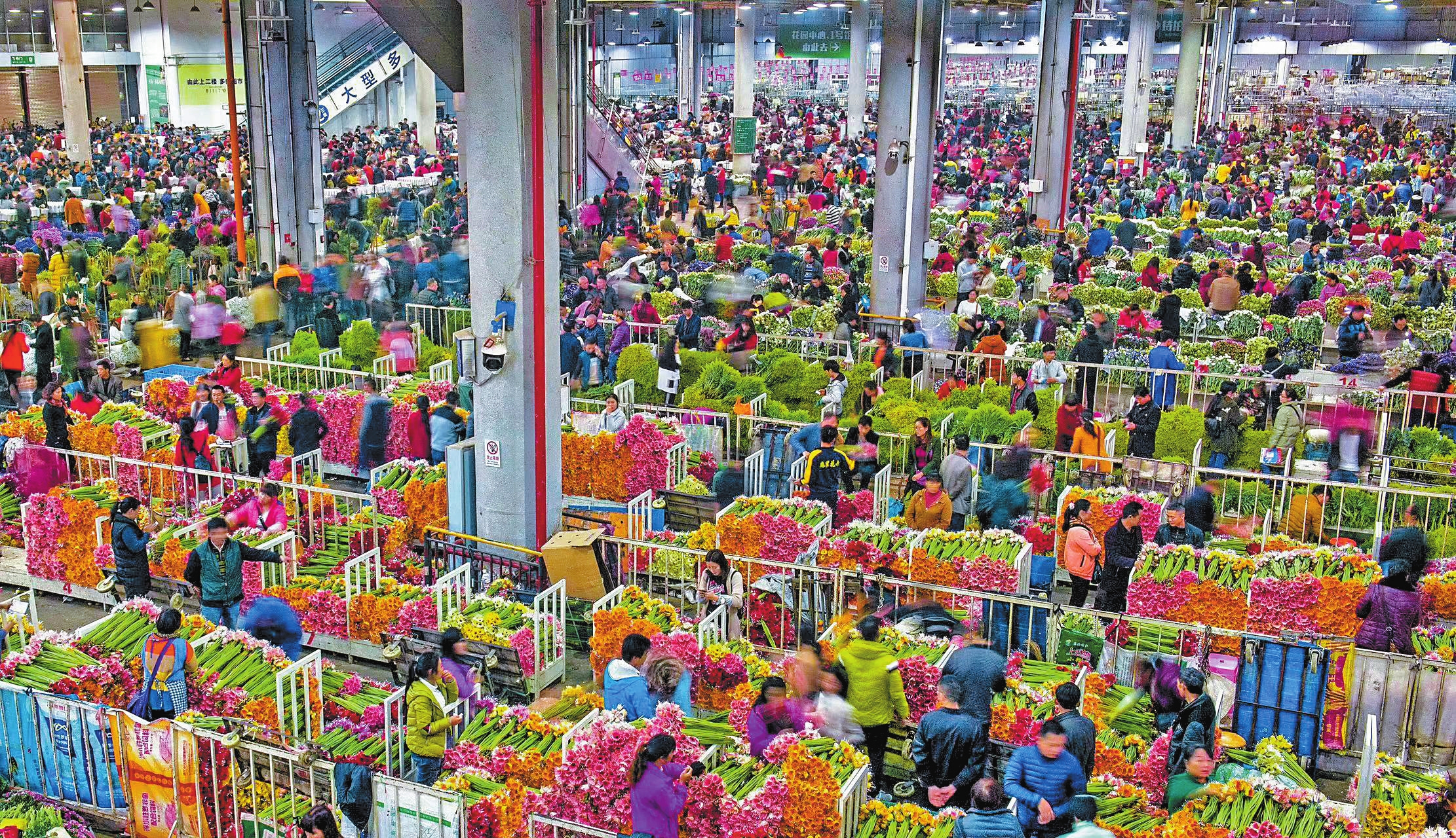 如今,斗南花卉市场汇集了全省乃至整个东南亚最绚丽秀美的四季鲜花。从白天到夜晚,游客、花商、花农穿梭在花海中,形成一道绚丽多彩的风景。