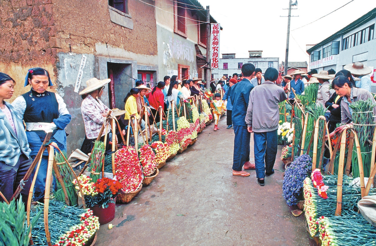 斗南鲜花名气渐渐传开,1990年前后,在斗南村的主路上,成捆、成筐的鲜花摆在街边售卖,花农、商贩将这条街挤得水泄不通,50米长的“斗南花街”由此形成。