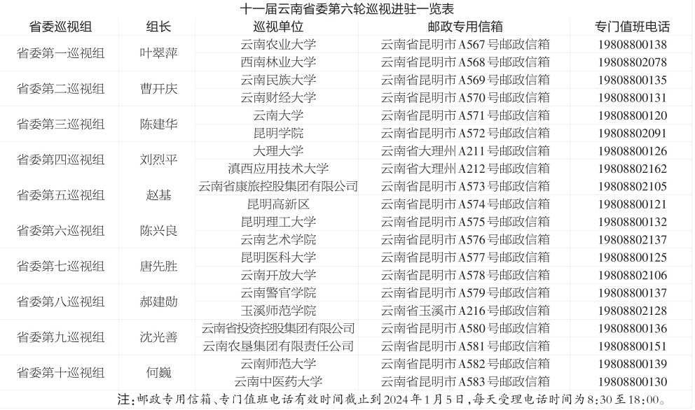 省委巡视组将在相关被巡视单位工作2个月左右。巡视期间设专门值班电话、邮政专用信箱,主要受理反映被巡视党组织领导班子及其成员,下一级党组织主要负责人和重点岗位人员问题的来信来电来访,重点是违反政治纪律、组织纪律、廉洁纪律、群众纪律、工作纪律和生活纪律等方面问题反映。其他不属于巡视受理范围的信访问题,将按规定由被巡视单位和有关部门认真处理。省委巡视组受理信访时间截止到2024年1月5日。