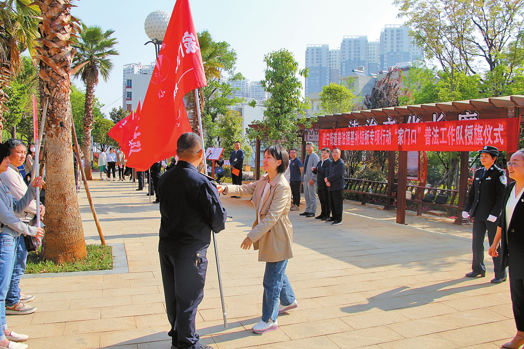 建宁街道统筹整合部门、社区干部、党员、专兼职网格员、党建引领基层治理工作队、义警、警官、法官、检察官、律师等资源力量,成立“家门口”党员先锋普法队、“家门口”百姓普法队、“家门口”义警普法队、“家门口”“三官一律”普法队、“家门口”社区工作者普法队、“家门口”街道工作者普法队、“家门口”市区下沉干部普法队共7支140余人的普法工作队,为每支普法队授旗,为每一名普法队员发放普法工作包。