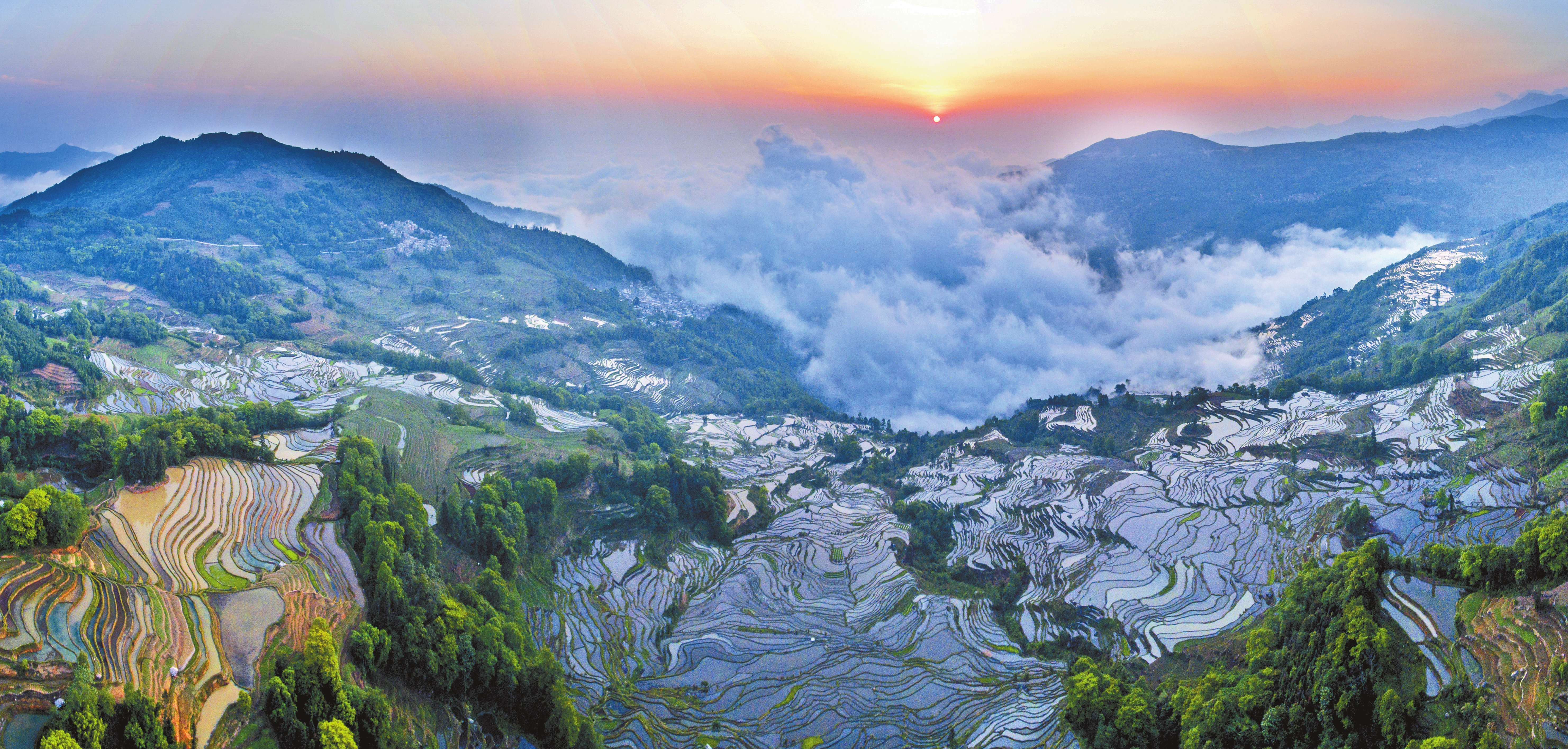 每年立冬过后,便到了元阳县哈尼梯田的灌水期,蜿蜒流过的山泉水填满万亩田坑。从山脚到山顶,蓄满水的梯田埂回堤转,层层叠叠,犹如天梯。崇山峻岭间,万亩梯田之上,云海时而轻歌曼舞,时而万马奔腾,似瀑布像流云,如梦如幻,若隐若现,宛如流动的山水画卷,令人惊叹不已。 本报记者 饶勇 通讯员 肖琳平 文/图