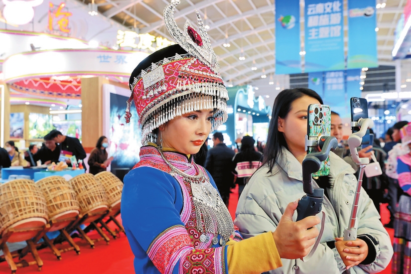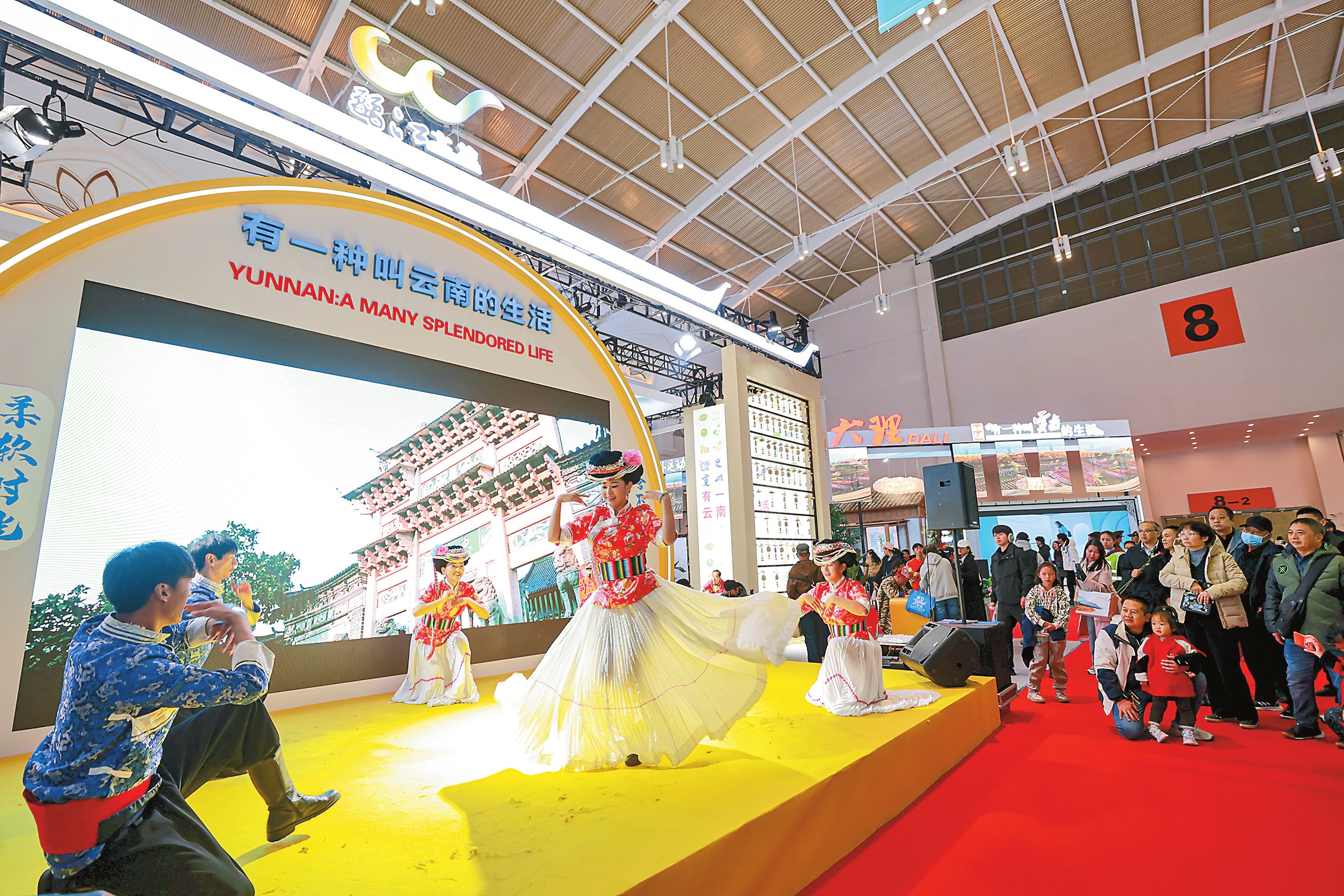 旅交会期间,各展团及旅游推介活动纷纷亮相,通过多种形式充分展现展示各具特色的旅游形象、新产品、新业态等,开展交流合作。图为云南文化和旅游主题馆民族风情展演。本报记者 雷桐苏 周灿 黄兴能 胡妤雅 摄