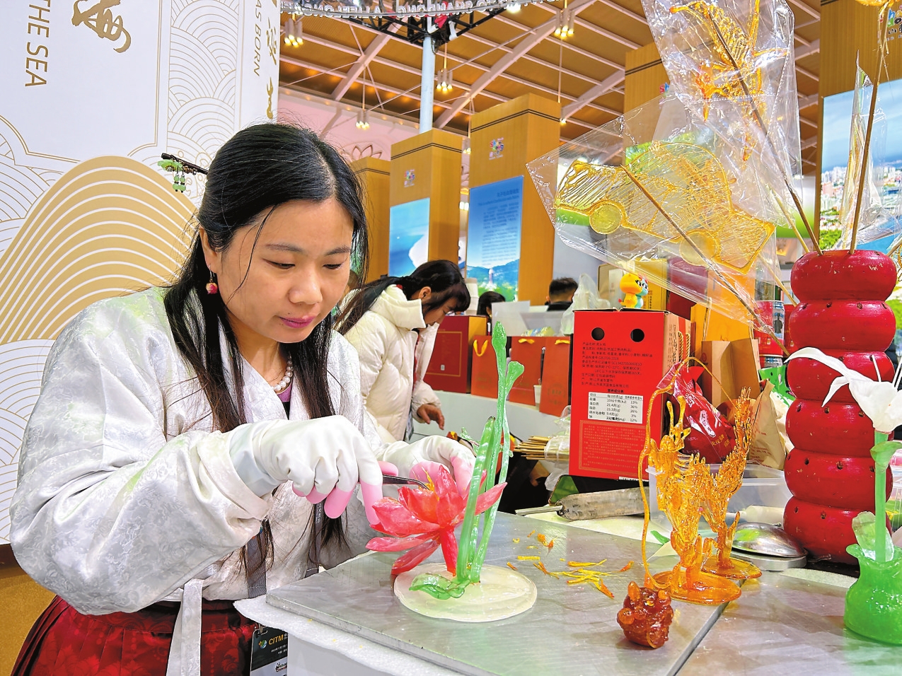 此次参加旅交会,是李然然第一次来云南。“我一直想来云南,想来昆明,这次圆梦了。在空气清新、自然环境如此优美的地方,一定要把最美的展品带给这里的朋友。一会儿,我就用糖制作红嘴鸥、玫瑰花给观众看。”李然然说,在旅交会结束后,自己要在云南多玩几天,看看滇池,好好体会“有一种叫云南的生活”。本报记者 王韵雅