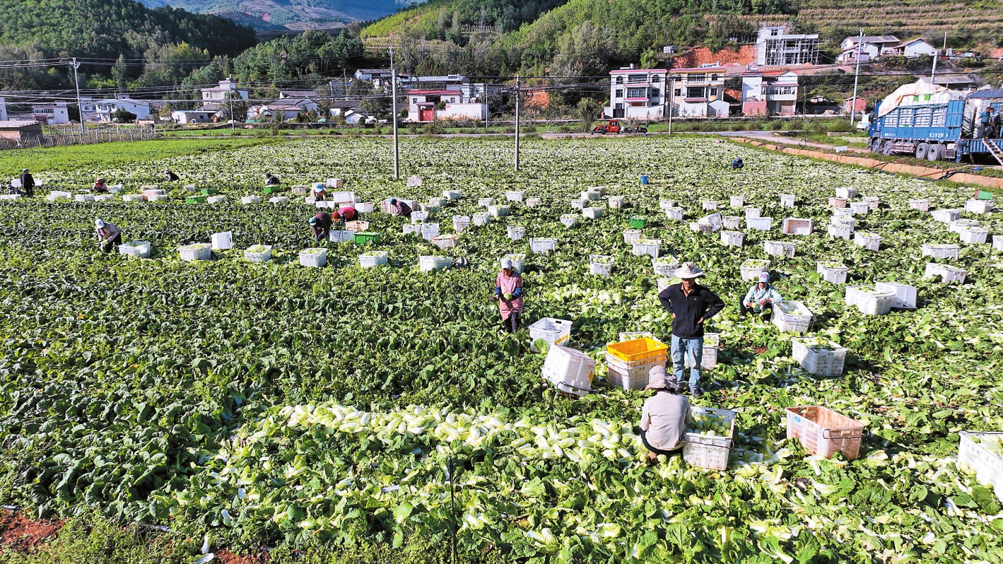 在会泽县五星乡石龙村云南正绿种植有限公司的娃娃菜种植基地里,几十名工人正在忙着采收成熟的娃娃菜。工人们收割装筐、挑运装车,各司其职,忙得不亦乐乎。