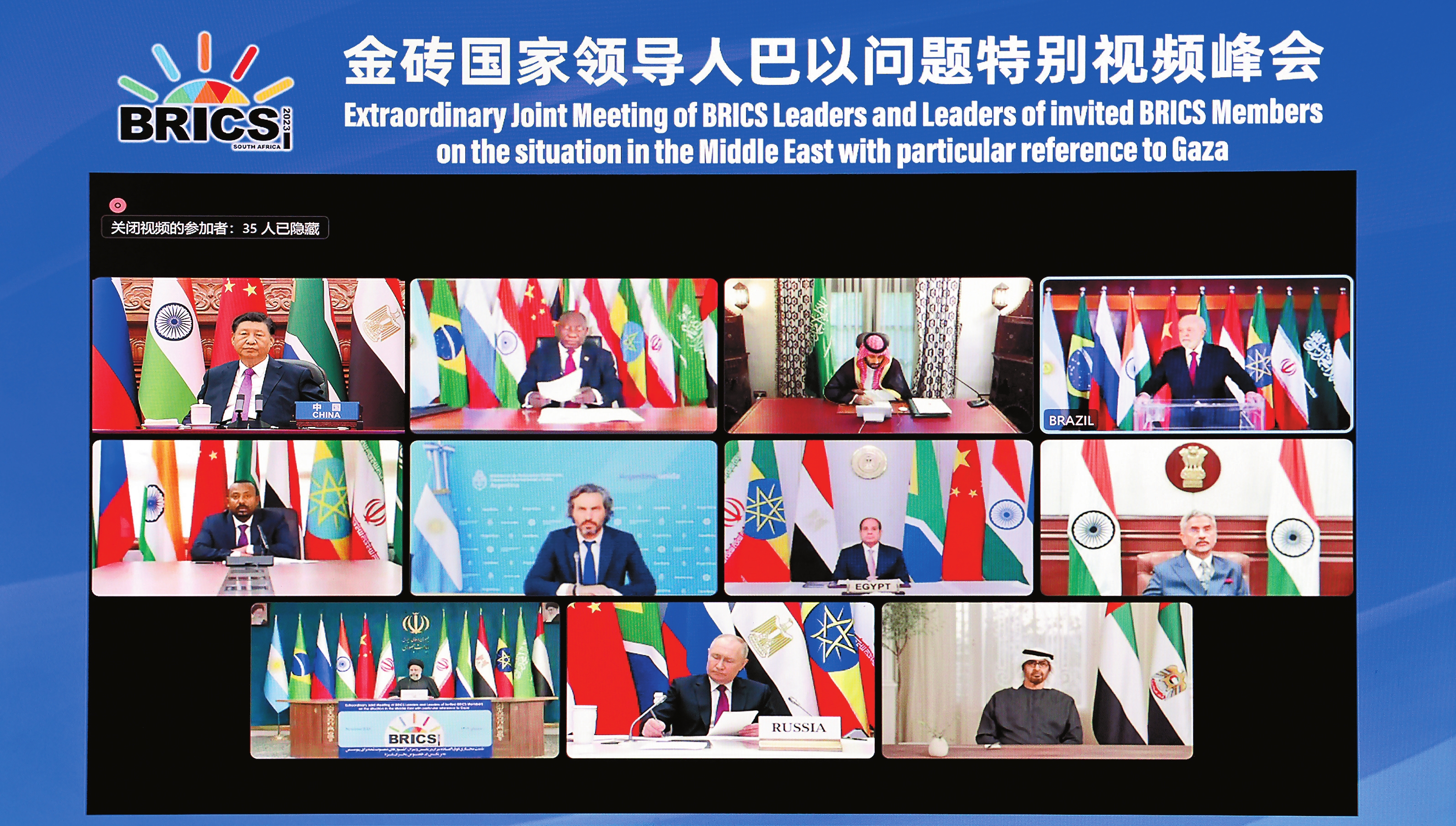 ● 当前形势下,金砖国家就巴以问题发出正义之声、和平之声,非常及时、非常必要。加沙地区的冲突已持续一个多月,造成大量平民伤亡和人道主义灾难,并出现扩大外溢趋势,中方深表关切。当务之急,一是冲突各方要立即停火止战,停止一切针对平民的暴力和袭击,释放被扣押平民,避免更为严重的生灵涂炭。二是要保障人道主义救援通道安全畅通,向加沙民众提供更多人道主义援助,停止强制迁移、断水断电断油等针对加沙民众的集体惩罚。三是国际社会要拿出实际举措,防止冲突扩大、影响整个中东地区稳定。各方应该将联合国大会和安理会有关决议要求落到实处